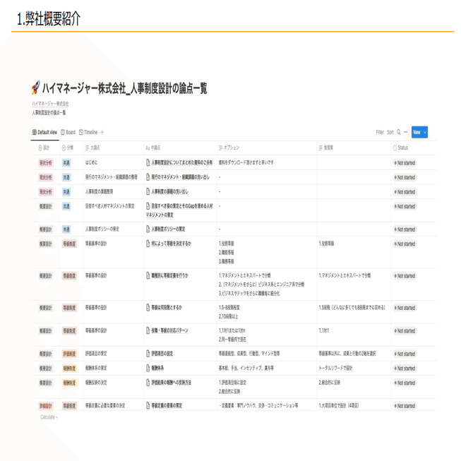 論点につきましては、上記の人事制度の論点一覧にて約40個記載されており、各論点に対するオプションや推奨案というものも記載されております。