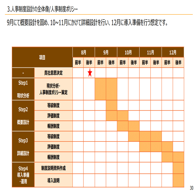 例えば年末までに人事制度を作成して9月から設計をスタートする場合であれば、9月の前半に、現状分析を行い、後半から概要設計を行います。