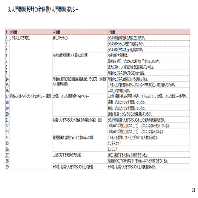 では、人事制度ポリシーを作っていく上でどういった観点で考えばいいのかを弊社がヒアリングで活用しているフォーマットを基にご説明します。