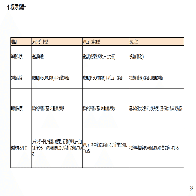 ただバリューがかなり評価の中でも重要でそこを特に重視していきたいという場合は、バリュー重視型も考えられますし、海外の人の採用が多かったりとか、本当に役割によって、一気に金額を変えていきたいというような場合はジョブ型を取るようなケースもあります。