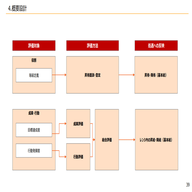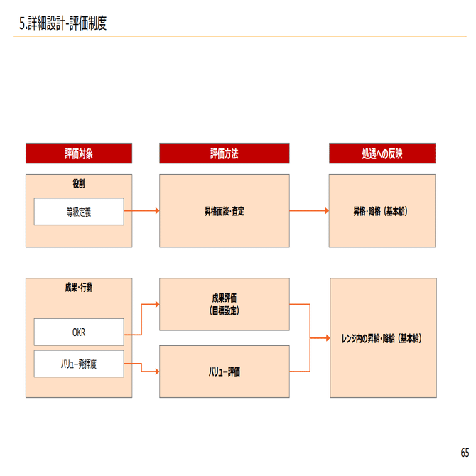 つまり、等級定義表に基づいて、成果は目標達成度で見て、バリューは行動評価で見てそれで総合評価が出て昇降級するというような形になっています。