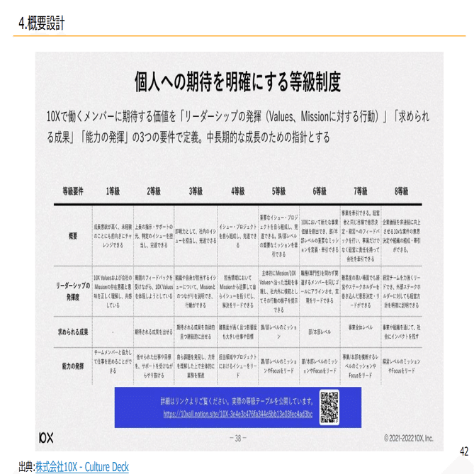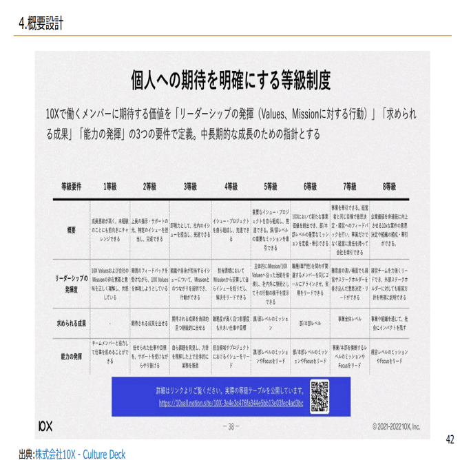 こちらも公開されてる資料になりますが、等級定義がそれぞれあって、リーダーシップの発揮度、求められる成果、能力の発揮と、こういった3要素で等級が決まっていて、これで昇格降格が決まっていくような形になっています。