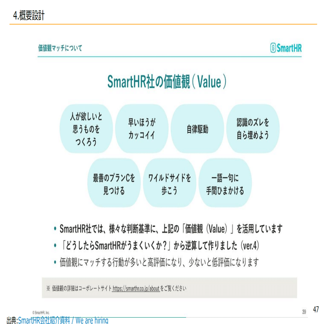 バリューに関しては、各等級別にバリュー定義があり、各等級別の基準がどれだけできてるか基準通りであればBですし、上に近ければA、というような形で評価します。