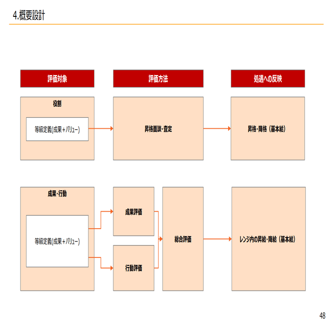 つまり、等級があり、成果と行動があって、等級は昇降格にして成果と行動で基本給が決まるというような形になっております。