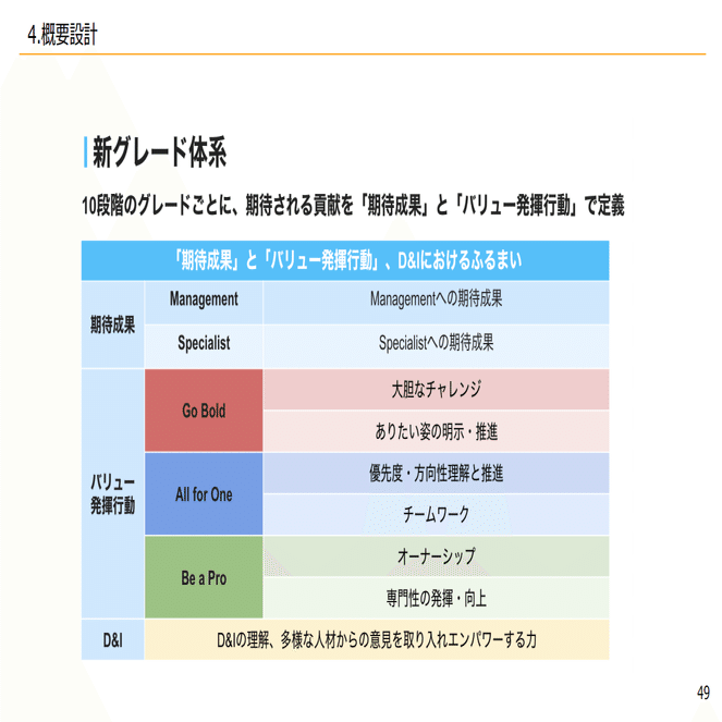 バリュー重視型は、等級定義の中にバリューの要素も含めて、別途行動評価という行動評価表を作らず、バリュー評価で、そのまま等級定義の中のバリュー定義を使って評価するというような形になっています。