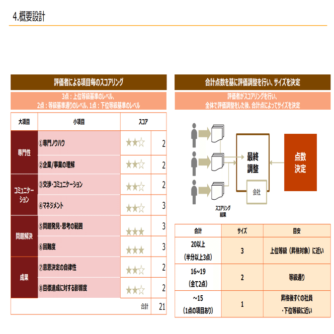 例えば、要素として専門性、コミュニケーション、問題解決、成果という4要素があったときに、このそれぞれの中で二つわかれているとして、点数付けをして例えば21点であれば、サイズ3というような形で決まります。