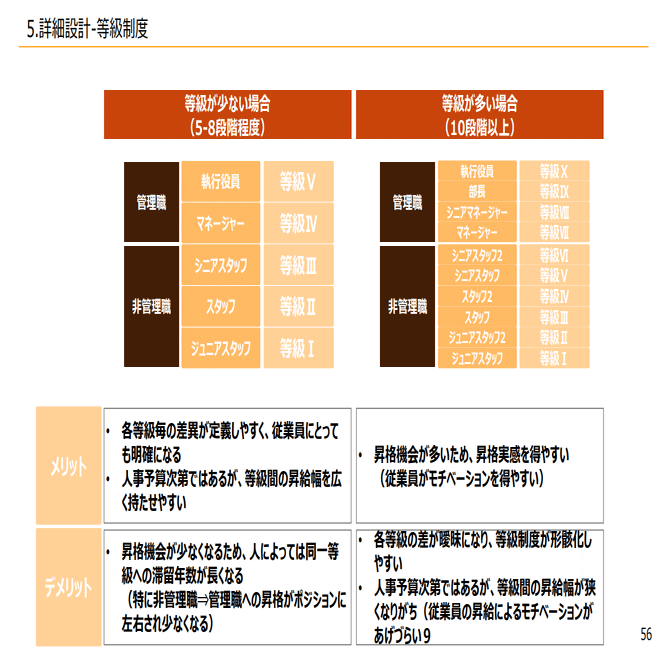 おおよそ20人以下であれば4段階ぐらい、50人以下であれば、5段階ぐらい、100人で6段階ぐらい、300人~400人になって7段階、8段階ぐらいといったイメージで、等級の数に関して従業員数によって決まるような形になっています。