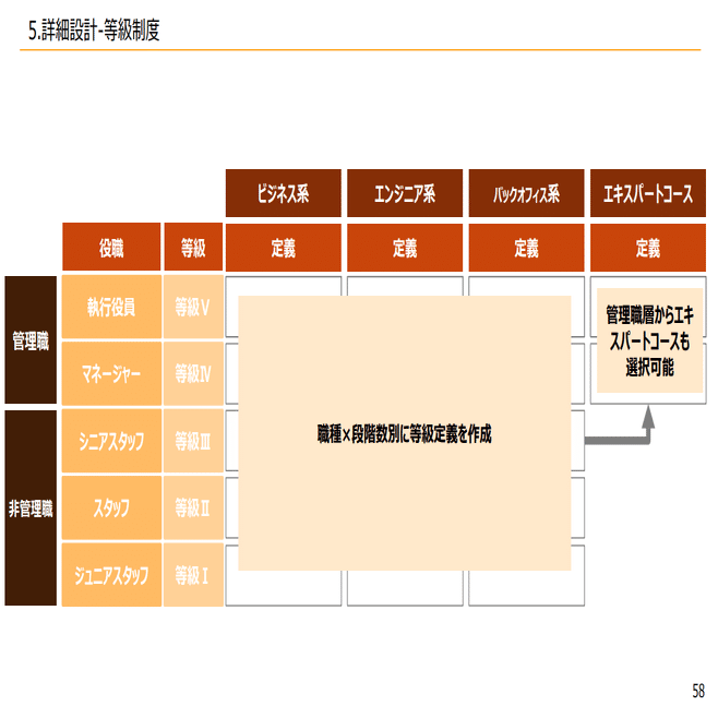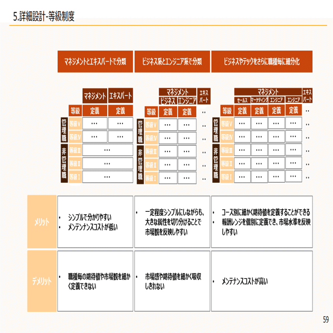 例えば多いのはマネジメントとエキスパートコースで分けたり、さらにマネジメントの中をビジネスとエンジニアで分けたりなど、こういったコースがあり、各等級段階があってさらに中身を等級の要素を決めていく流れになっています。