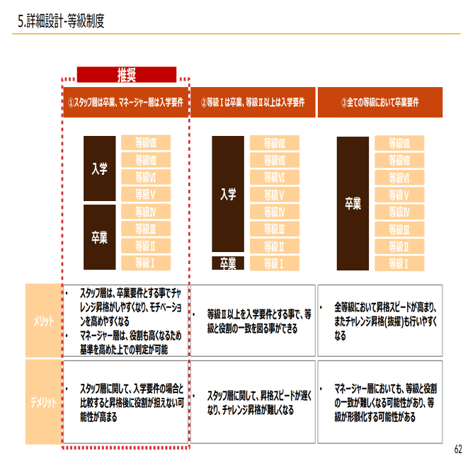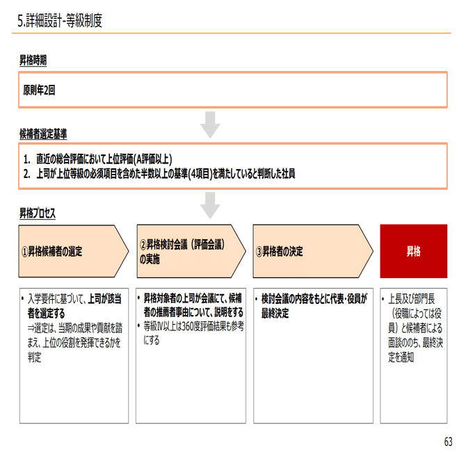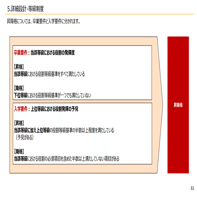 昇降格に関しましては、卒業要件と入学要件というような考えがあり、今いる等級で基準が全部できていれば次の等級なれる可能性があるというものが卒業要件になっています。