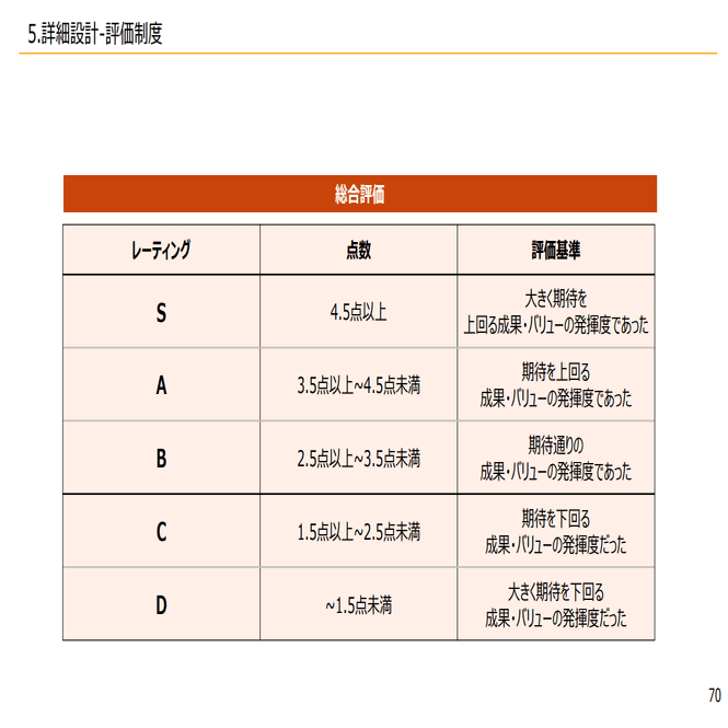 評価に関しては、先ほどのところで、期待する成果が目標設定の評価になっており、期待する行動がバリュー評価になり、成果評価と行動評価で総合評価出す形になっております。