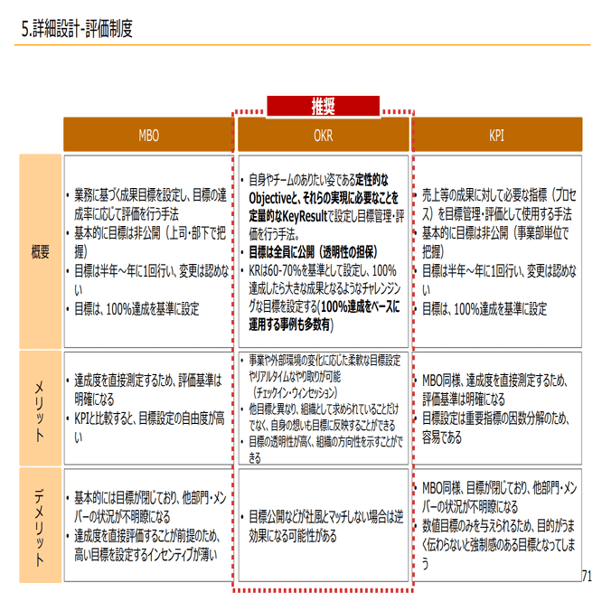 OKRに関しては6、7割ぐらいでチャレンジングな目標立ていくのが教科書的な運用になっていますが、ただ実際はこの6、7割にすると結構評価の面で運用が大変になるために、MBOと同じように100%達成をベースにして、ただ公開したりとか、密にコミュニケーションして、軌道修正していくというところが、最初にスタートする場合は一番やりやすいかなというふうには思っています。