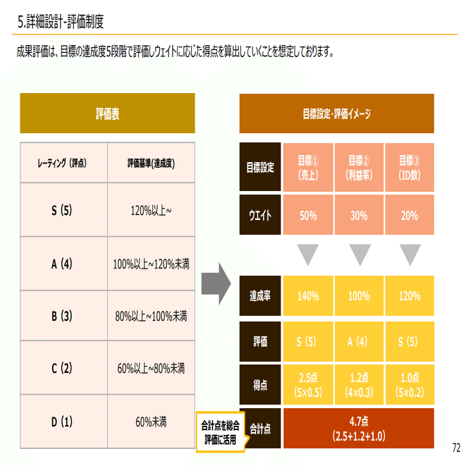 その場合には、MBOと同じような形で、各目標がいくつかあったらそれぞれのウエイトが設定されていて、達成率があって、達成率ごとに点数が出て、それを元に計算するイメージで評価する形になってます。