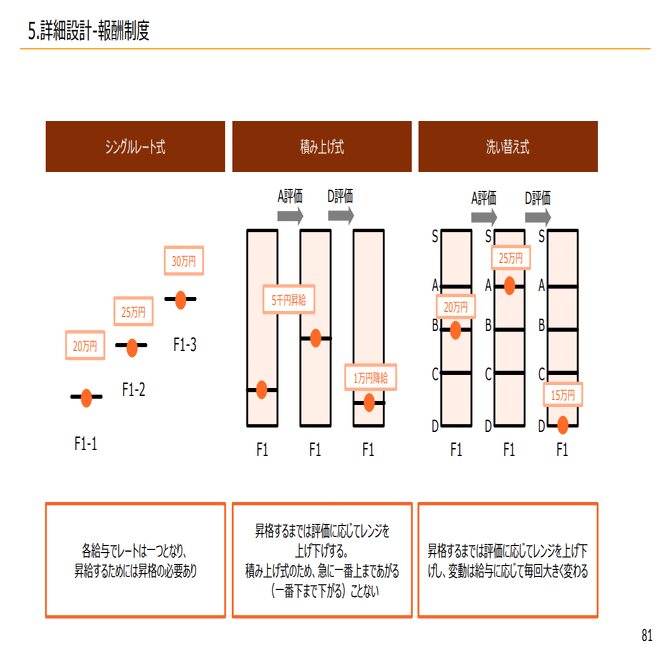 それぞれのパターンで、等級制度、評価制度、報酬制度がどうなっているかをご紹介します。