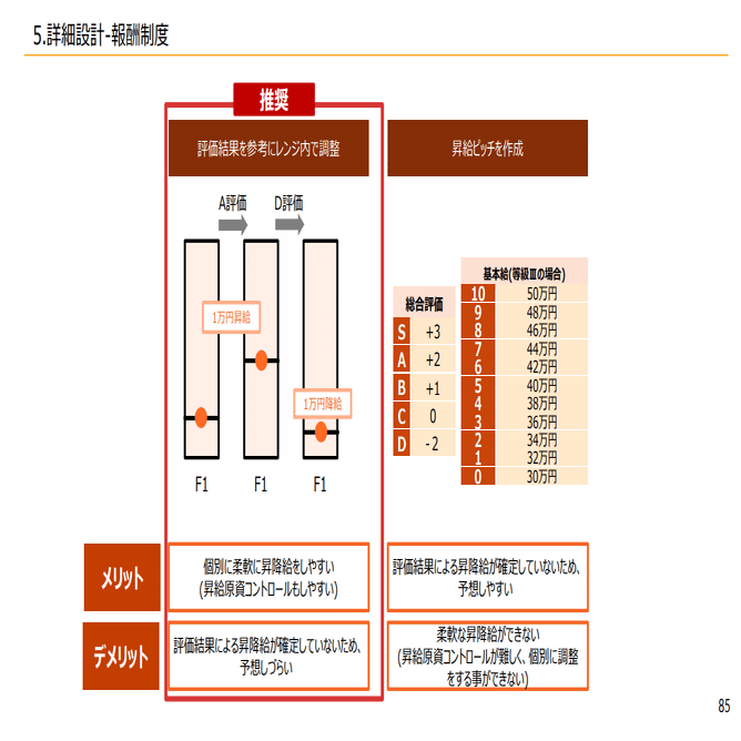 そして昇給は何で決まるかというと、いわゆる目標の達成度と行動発揮度で、これが成果評価と行動評価があって総合評価が決まって、レンジ内で上下するというような形になっています。