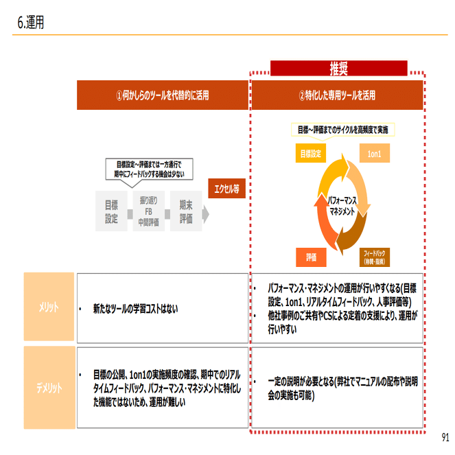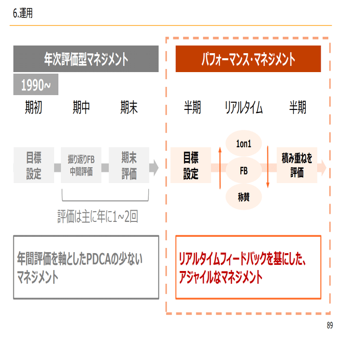 この目標を立てて、間で1on1をして、細かくフィードバック・称賛して評価するというような、そんなパフォーマンス・マネジメントが大切になってきます。