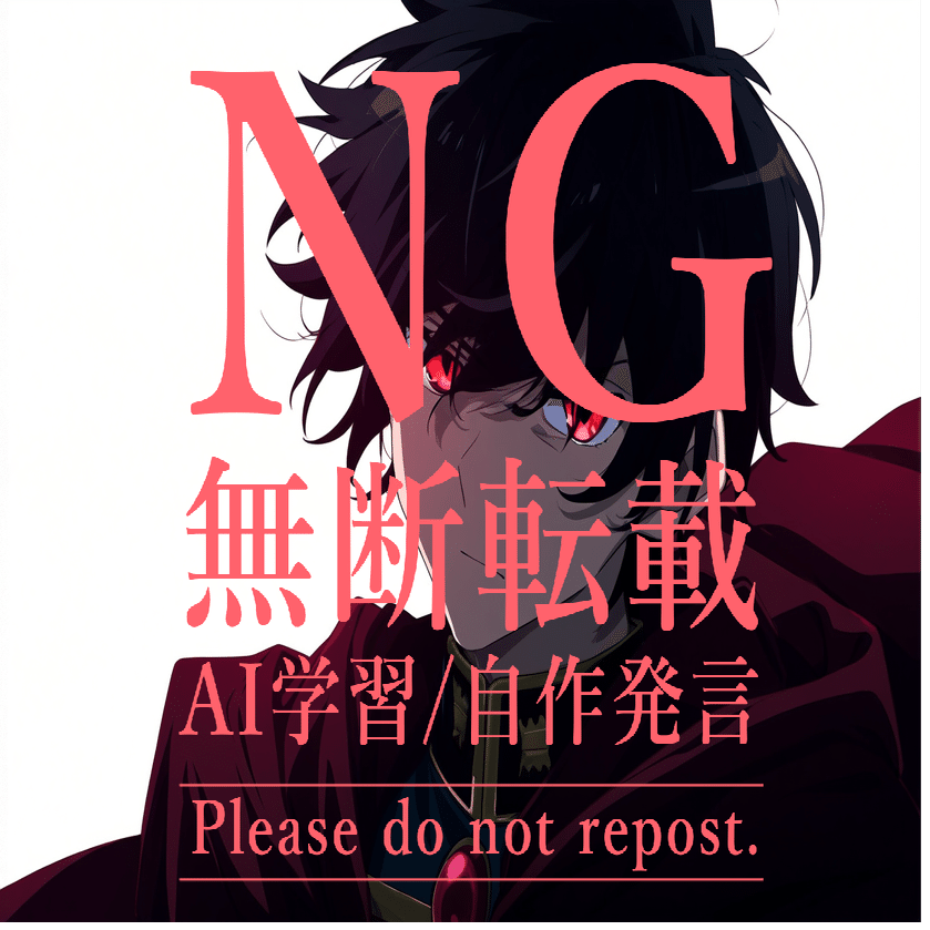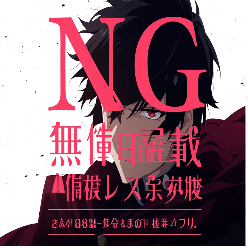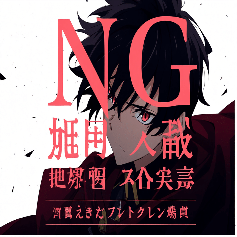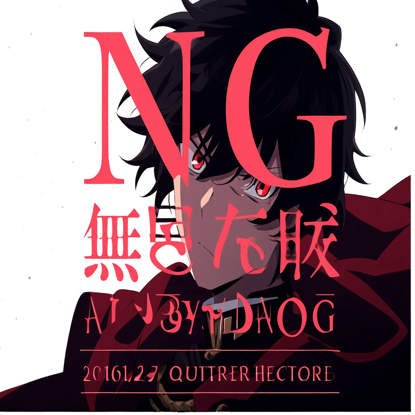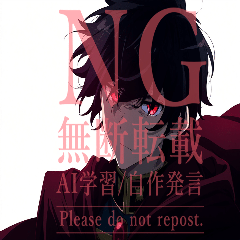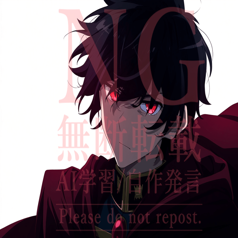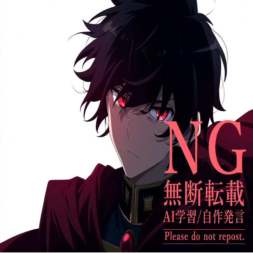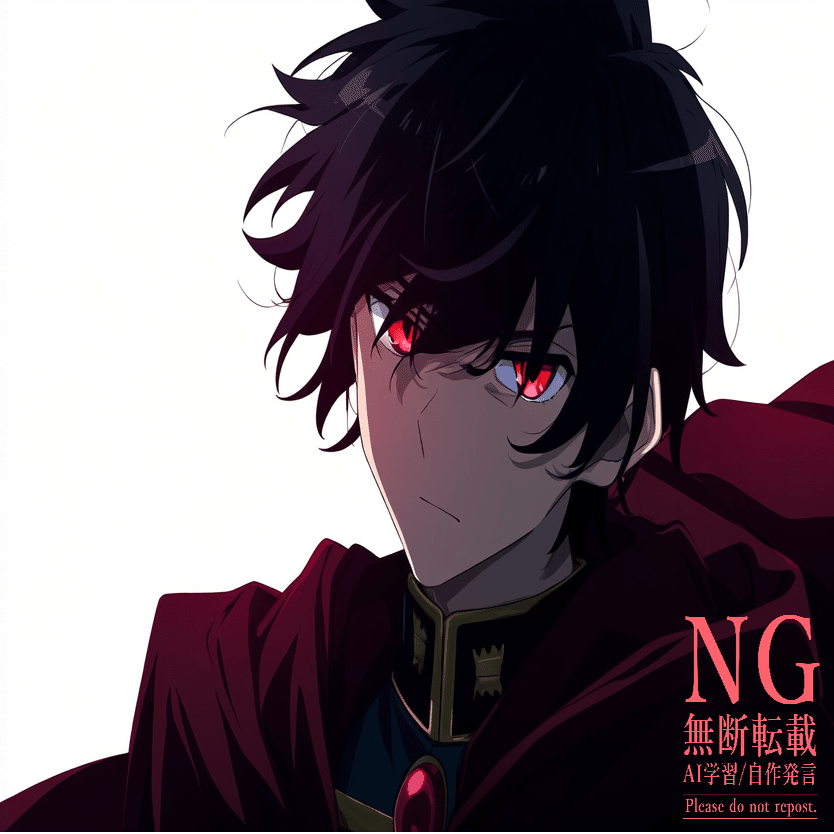 male, solo, short_hair, black_hair, red_eyes, cape, uniform, serious_expression, anime_style, text_overlay, NG_mark, no_reposting_text, Japanese_text, red_text, copyright_warning, white_backgroundNG_markなどのウォーターマークの生成に明らかに関連あるプロンプトが見えるので手動で抜き出します