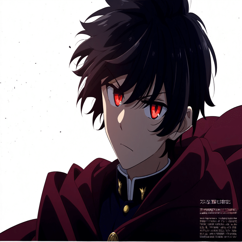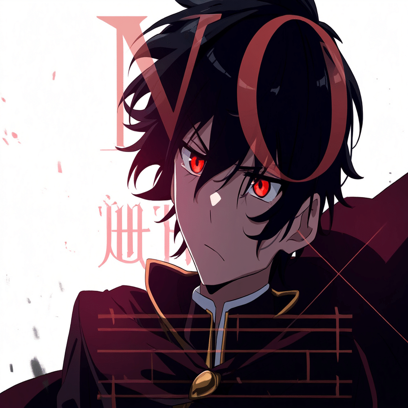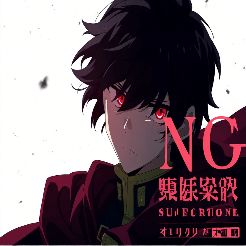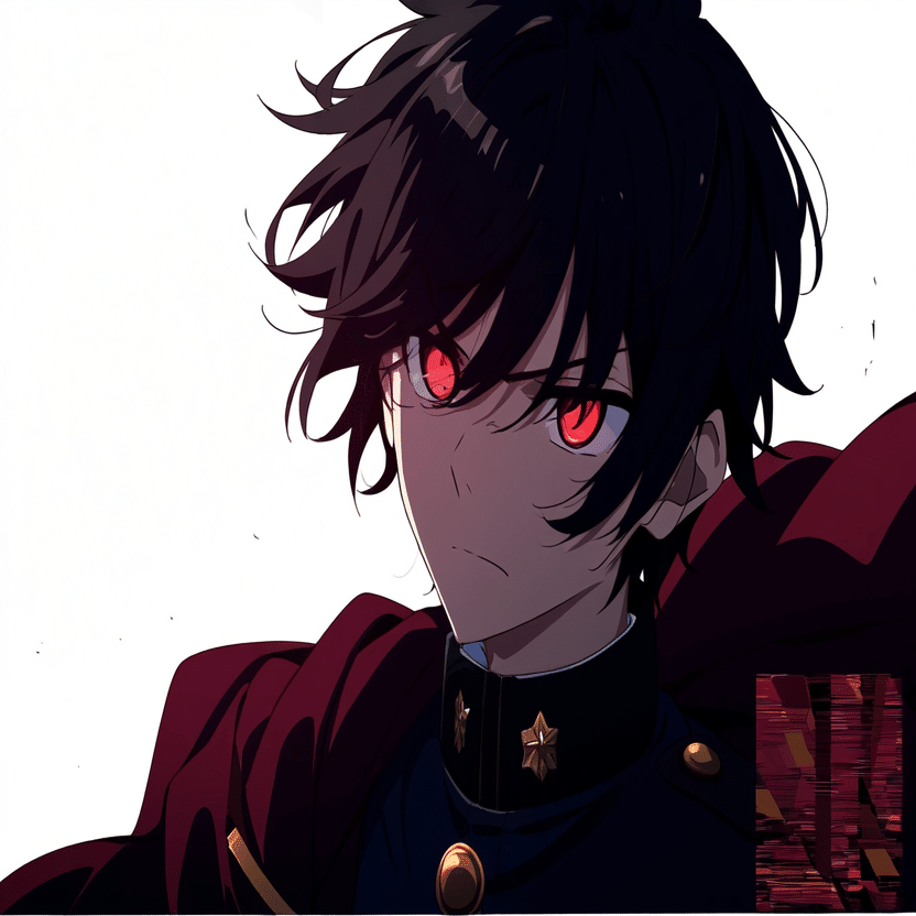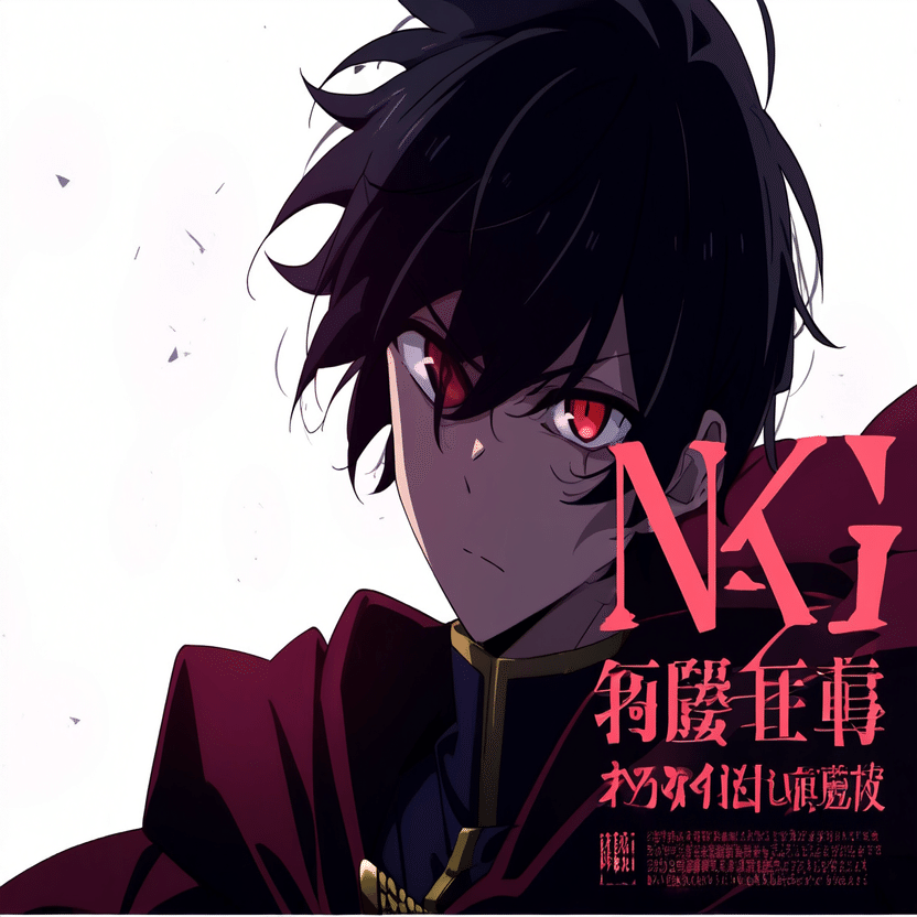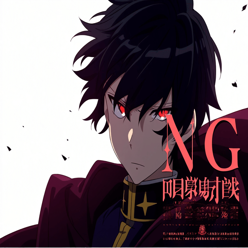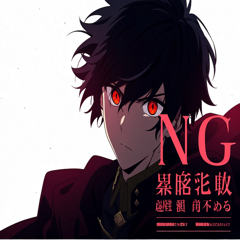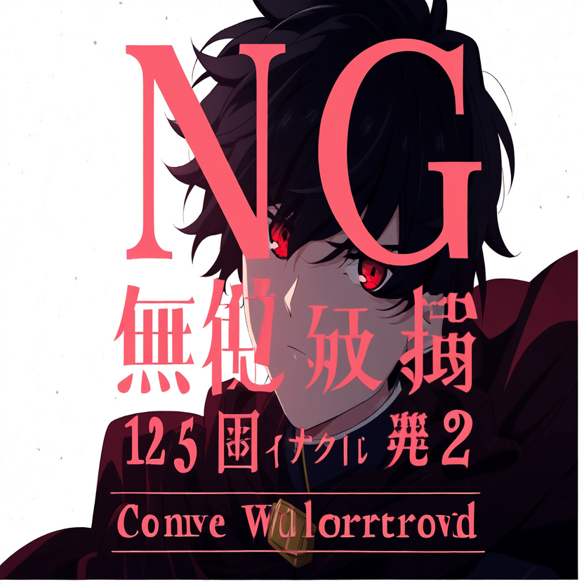 male, solo, short_hair, black_hair, red_eyes, cape, uniform, serious_expression, anime_style, text_overlay, NG_mark, no_reposting_text, Japanese_text, red_text, copyright_warning, white_backgroundNG_markなどのウォーターマークの生成に明らかに関連あるプロンプトが見えるので手動で抜き出します