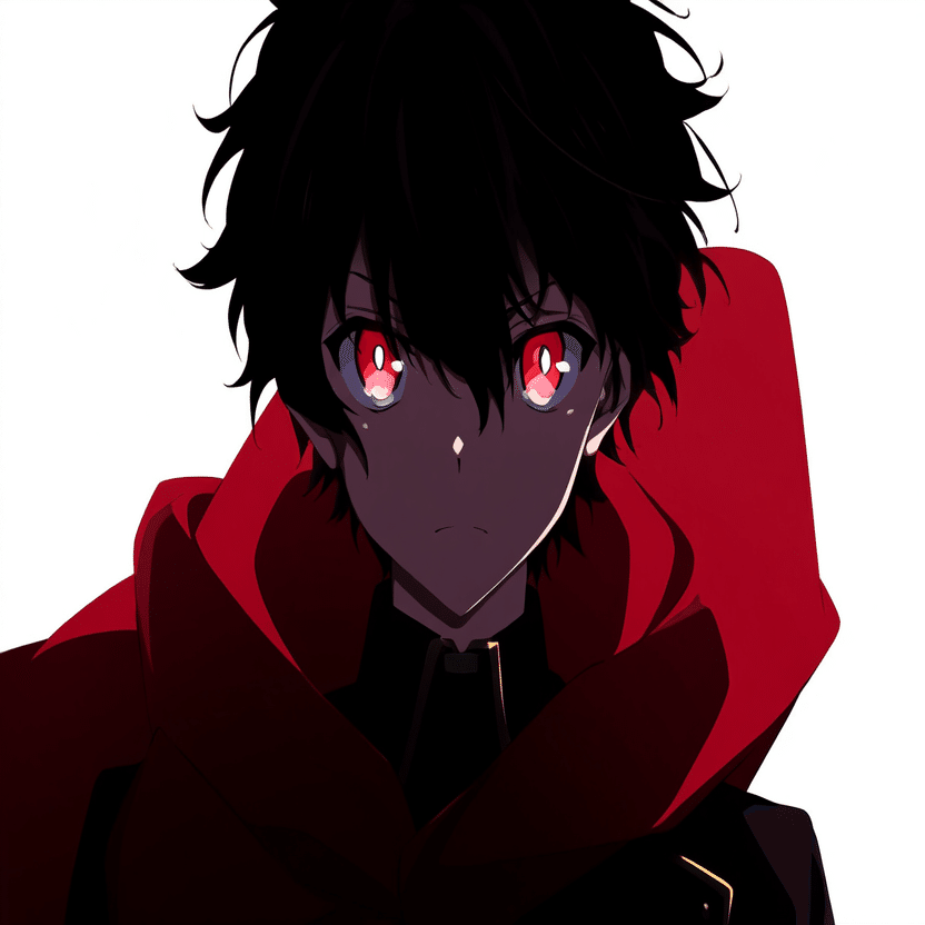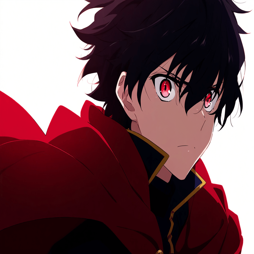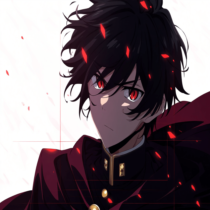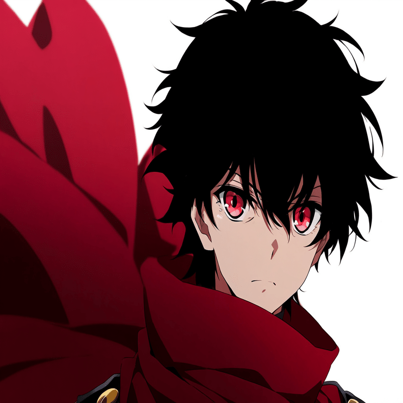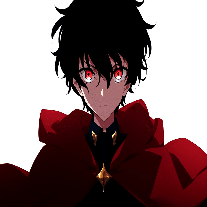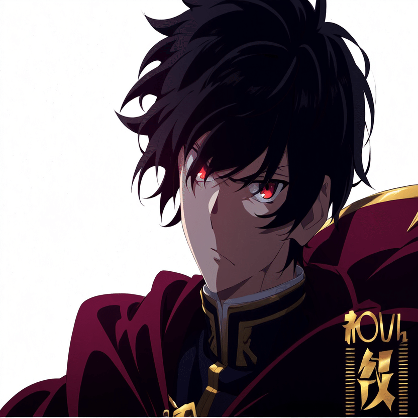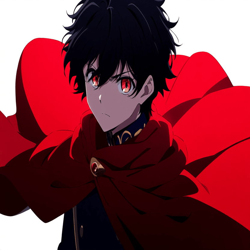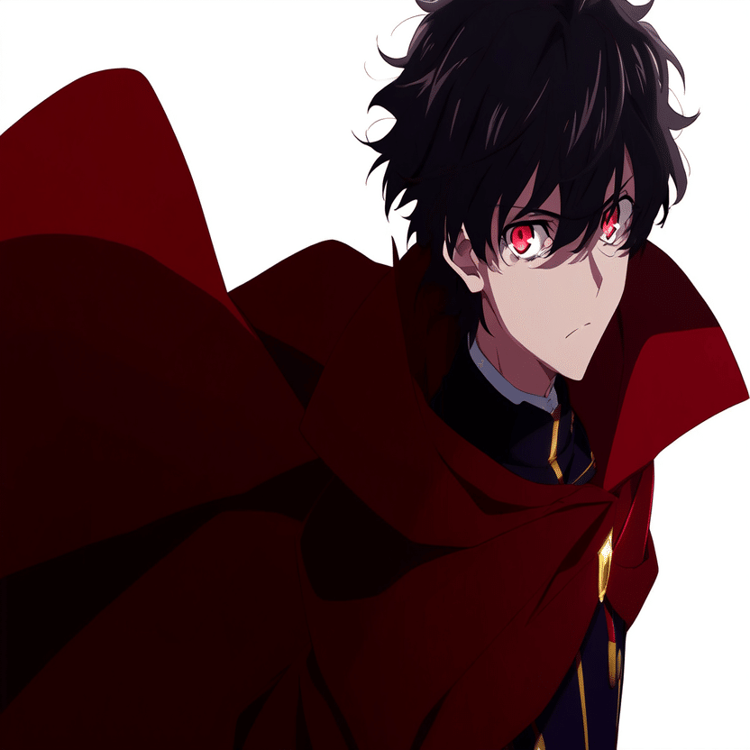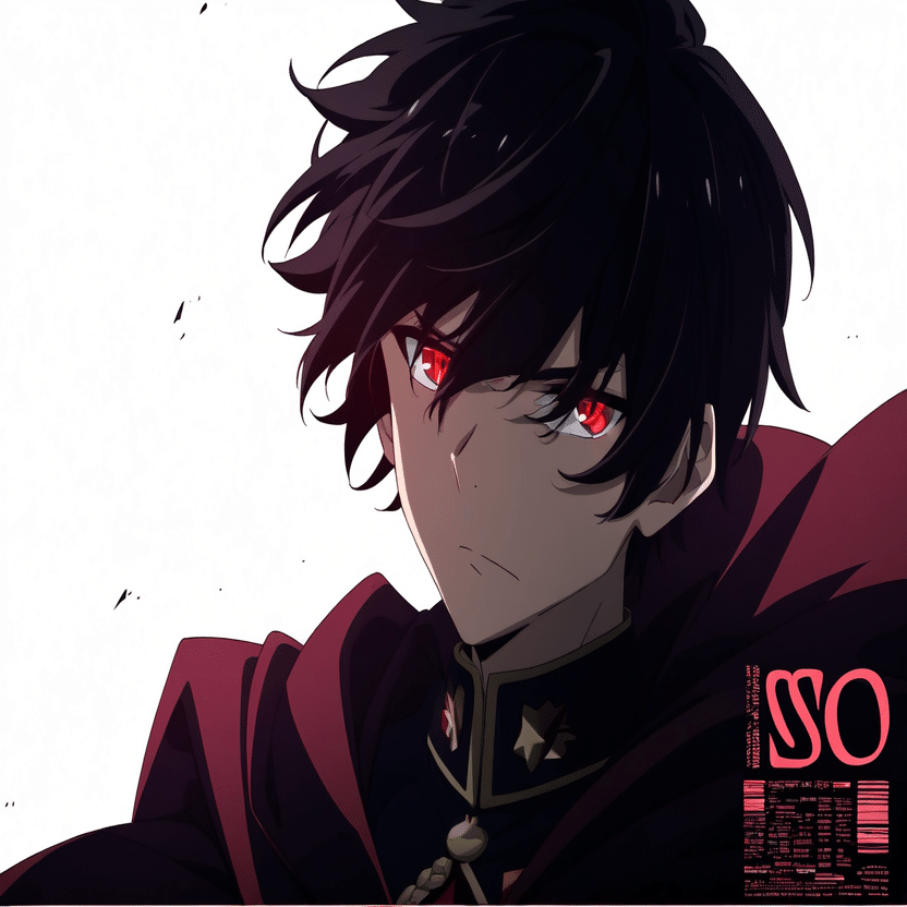 male, solo, short_hair, black_hair, red_eyes, cape, uniform, serious_expression, anime_style, text_overlay, NG_mark, no_reposting_text, Japanese_text, red_text, copyright_warning, white_backgroundNG_markなどのウォーターマークの生成に明らかに関連あるプロンプトが見えるので手動で抜き出します