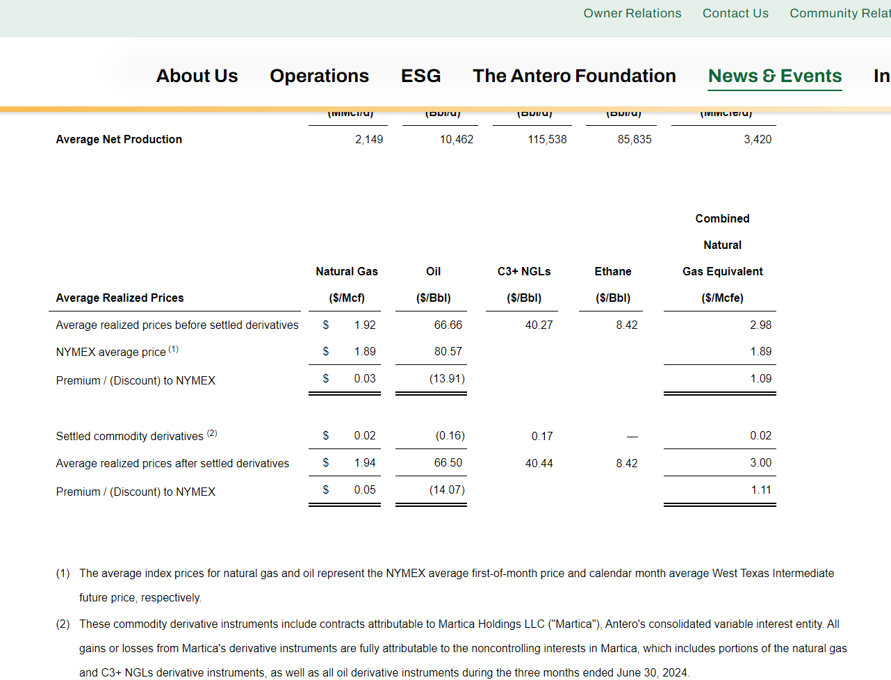 Antero Resources Average Price Received Calculation (Antero Resources Second Quarter 2024, Earnings Press Release)