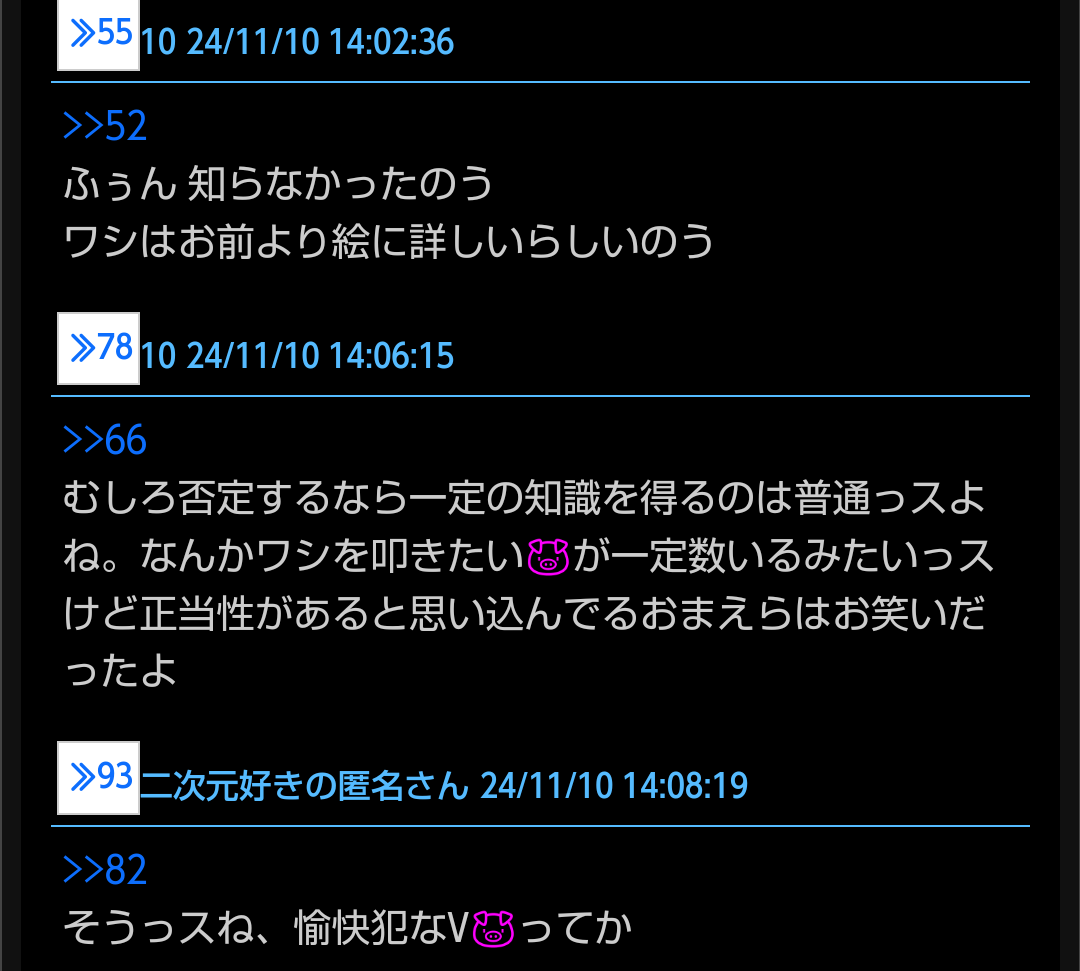 あと適当に愚弄しときゃ乗ってくれる奴もいるのに意味わからないこと言い始めるから叩かれるのん - 57二次元好きの匿名さん24/11/10(日) 14:02:52