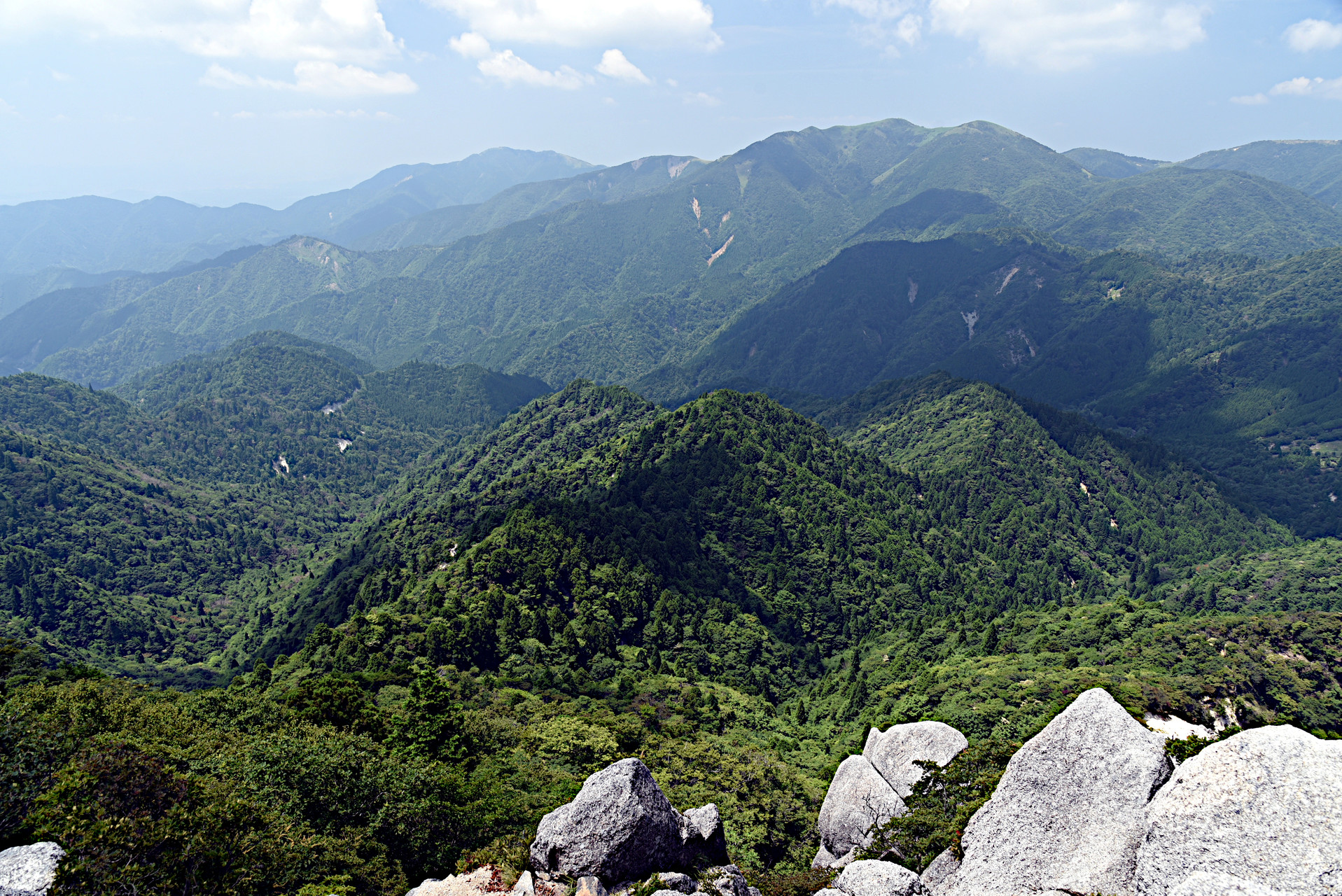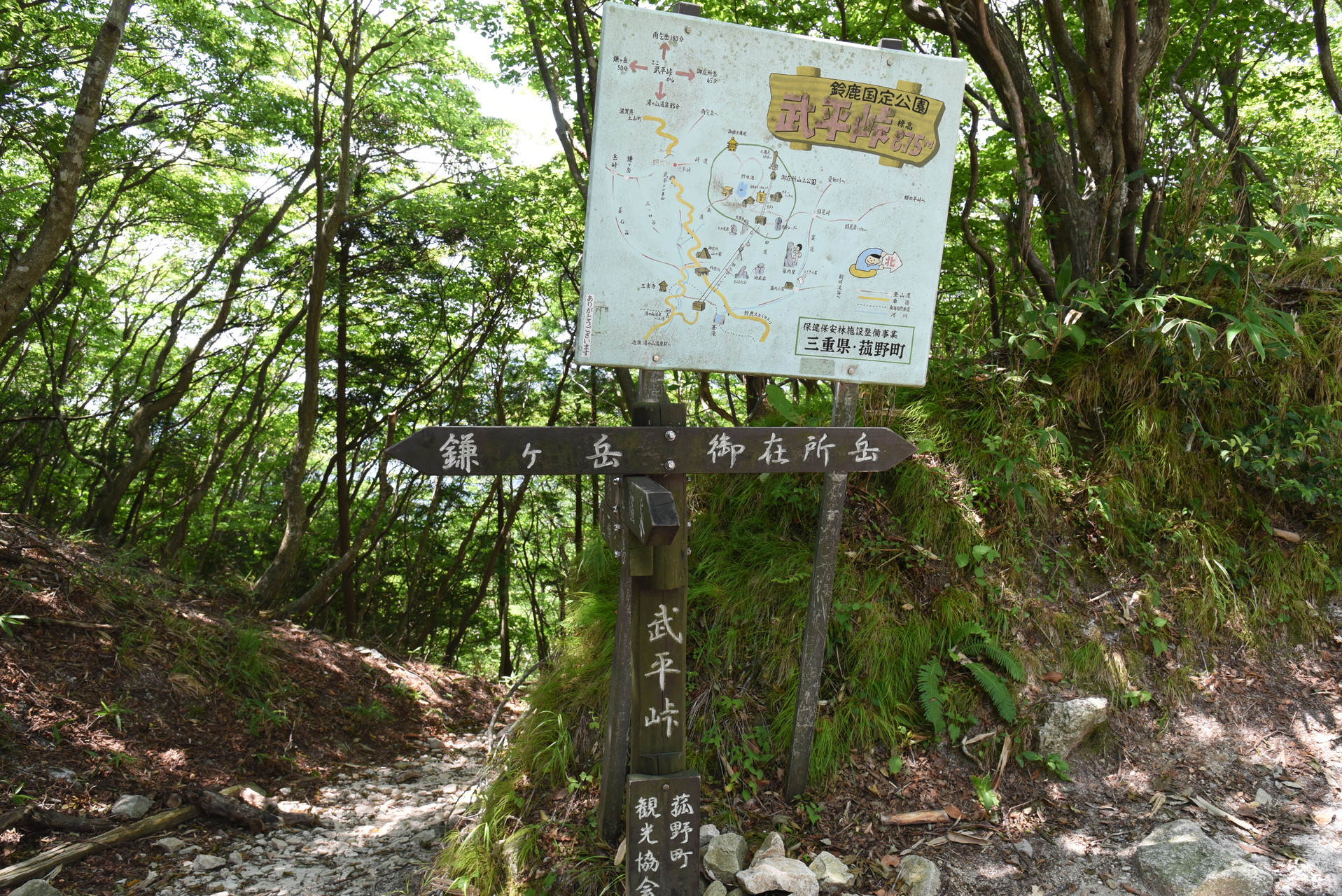 すべて見る中部地方の連日の殺人的暑さの中、加えて若干夏バテ気味な中で山登りなんてムリ!でも登らないと足が鈍っちゃうしなぁ... 秋のテント泊登山に向けた鍛錬もしなくちゃ...ということで、帰省の帰りに山に登ってみよう第2弾で武平峠から鎌ヶ岳にチャレンジ。 引き続きテント泊登山の鍛錬として今回は水も担いでなので、背負う重量が前回に比べて+4kgと着実に増加していることもあり、熱中症回避で行程が短いところを...ということからも、武平(ぶへい)峠から鎌ヶ岳を狙いました。 駐車場に着くといきなり「鎌田正清邸跡」という石碑が立っていて、?マジ!?なんでこんなところに?と2012年の大河ドラマ平清盛の鎌田正清に思いを馳せつつ出発準備。さすが、下界と異なり11時でも気温が29℃。 これくらいが人間が生きる気温であります。 当然今回も使わないテント・シュラフ・バーナーなどとともに水4L、そしてさらにペットボトル500ml×2と弁当を背負うと、さすがにズッシリと重いです。 でも、途中水場のないテント泊にはこれに耐えられないと行けないので、修行に耐えなければ! 駐車場がら武平峠までは先日の豪雨の影響もあるのかもですが相当にガレていて、花崗岩とそれが劣化した真砂。御在所岳や四日市方面への下山道の十字路たる武平峠にはすぐにつき、そこから鎌ヶ岳に向かいます。 荷物が重いとステッキの重要性が増すとは聞いていました。 ですが最近は軽身にて写真をバシャバシャ撮りながらの山行ばかりなので、長く使っていたステッキは不要と思っていました。しかし、荷物が重いとあったほうが断然楽ですね、きっと! 体の取り回しにステッキが欲しいと思うことが多数で、今回はそれを痛感。 しかしカメラとダブルステッキを使いながらはなかなかバランスが難しいだろうな...でも次は試してみようかと。 道中はほぼ花崗岩で、ところによって相当劣化しており滑りやすかったです。 道中は御在所岳、そして目指す鎌ヶ岳が間近に見え、大迫力。 ガレてわかりにくくなっている旧道をさがしつつ1時間ほど登ると山頂に到着、御在所岳を含む大パノラマと四日市方面の平野の大遠望、さらには険しい鈴鹿山脈の尾根尾根が見られました。 工程が短い山を選んでいることもあり、サクッと下山しました。 単身赴任先への道中の伊勢湾岸道を通過時の車の外気温表示は、なんと40℃でした。うげー。フェーン現象おそるべし。桑原桑原