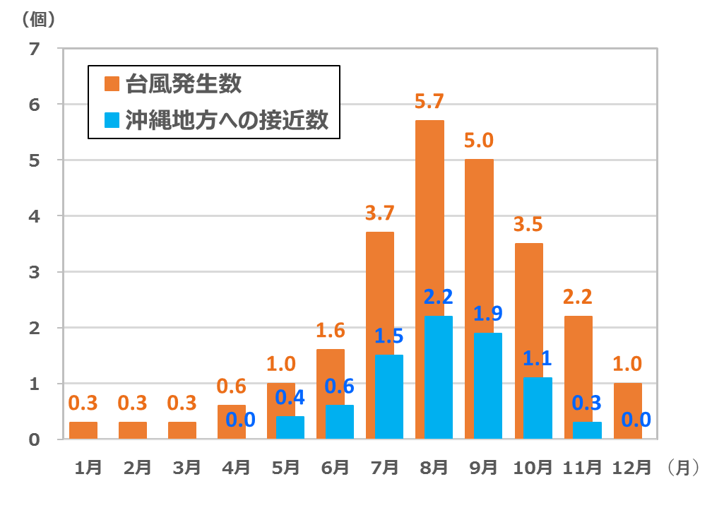 ・梅雨明けしていて ・6月は祝日ゼロ→人が来ないため安く ・行きたいホテルとかも取りやすい ・観光地も7,8,9に比べると空いていて、 ・そして6,7,8,9でぶち抜いて台風が少ない、圧倒的に 以上が理由です。 7,8,9も良いのですが、8月上中旬は高いし台風来るしで大変です。せめて9月。悪くても7月が良いはずです。9月上旬中旬は台風も少ないしまだまだガンガンに暑いので満足度高いはずです。 7,8月の暑さには劣るのでその点が懸念。なのでできれば9月も上旬ですね。シルバーウィークに行くのは避けたいところ。(涼しい沖縄に行ってもしょうがない、というのが前提です。 (下図: 気象庁 )