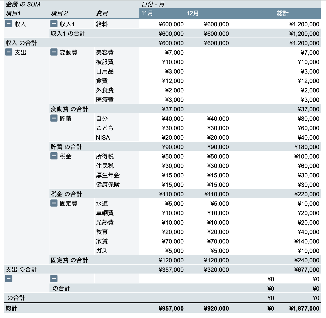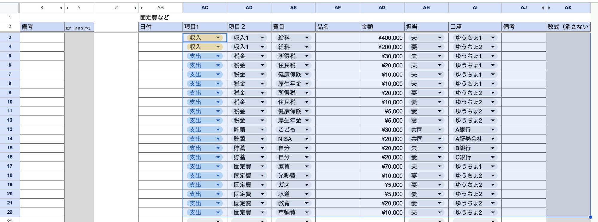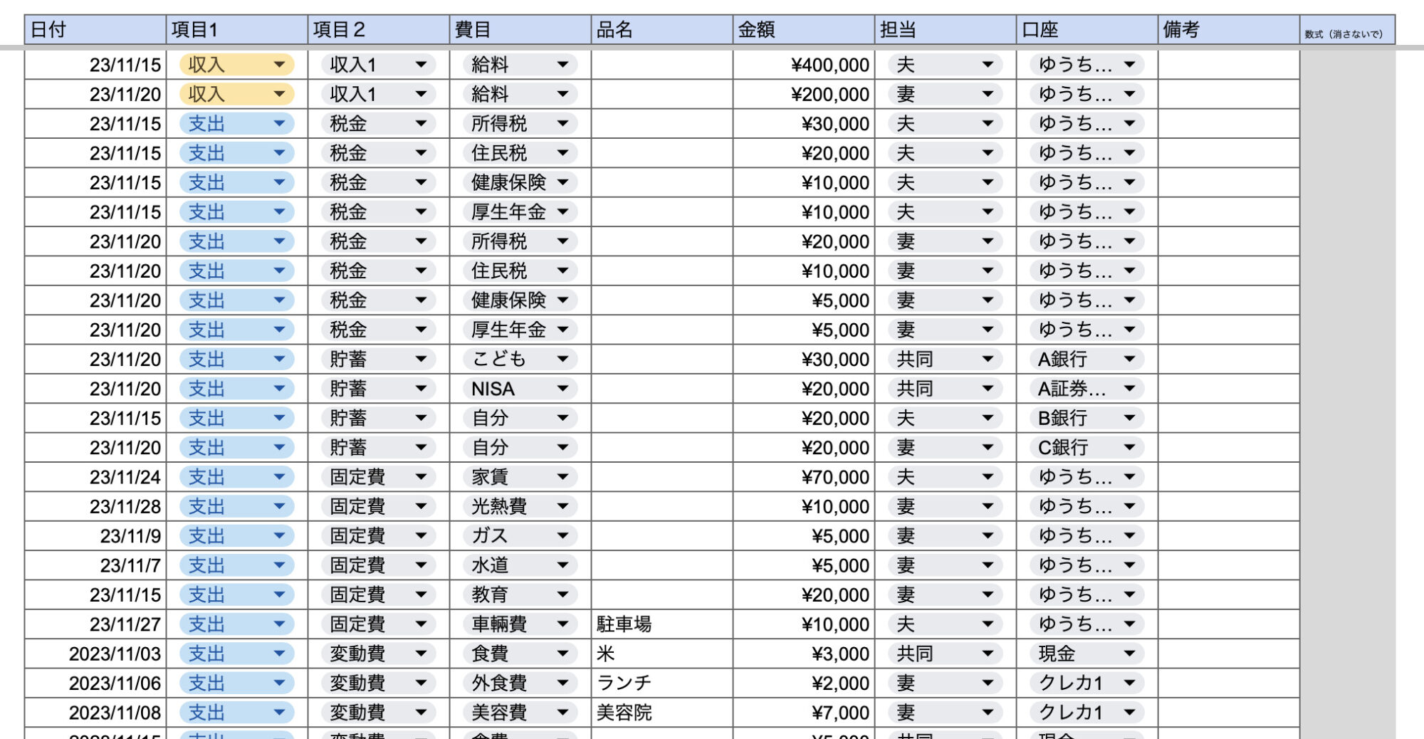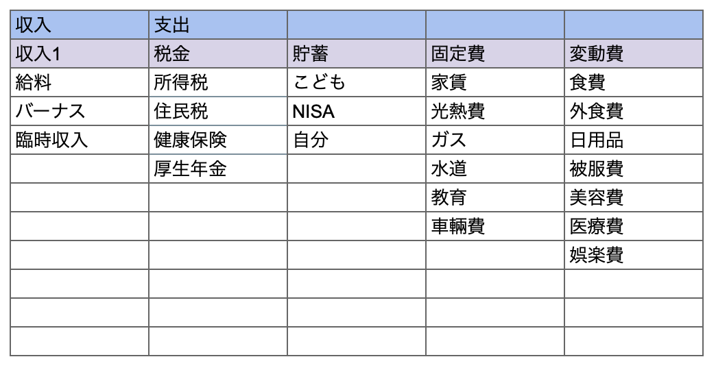 収入1、税金、貯蓄、固定費、変動費 - 費目