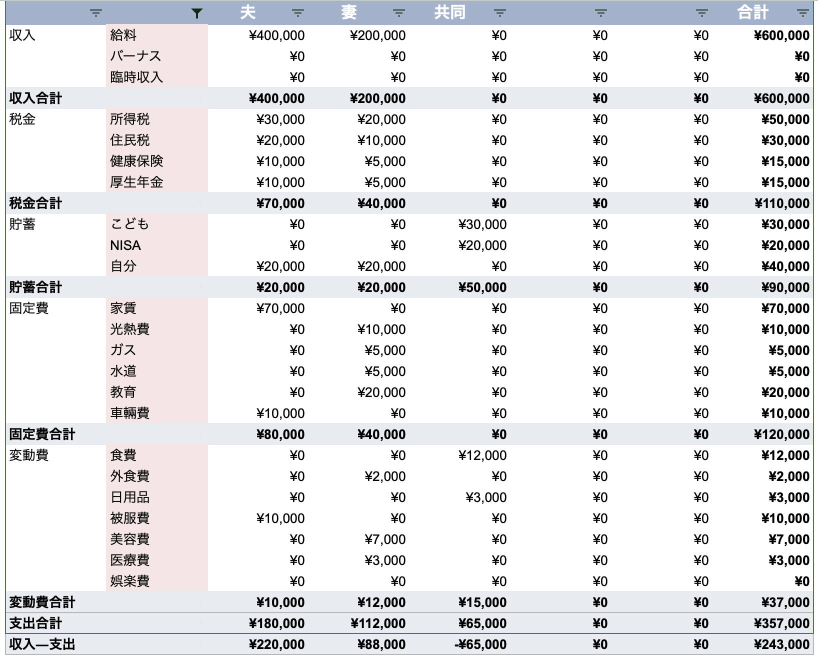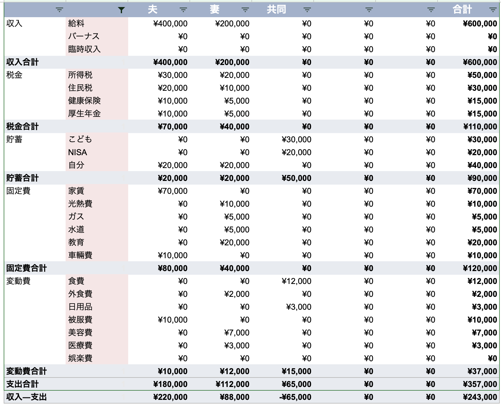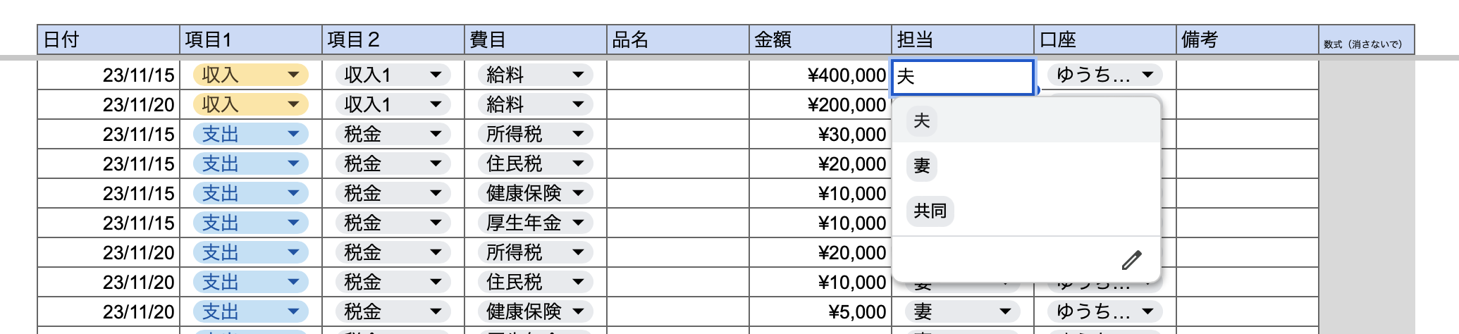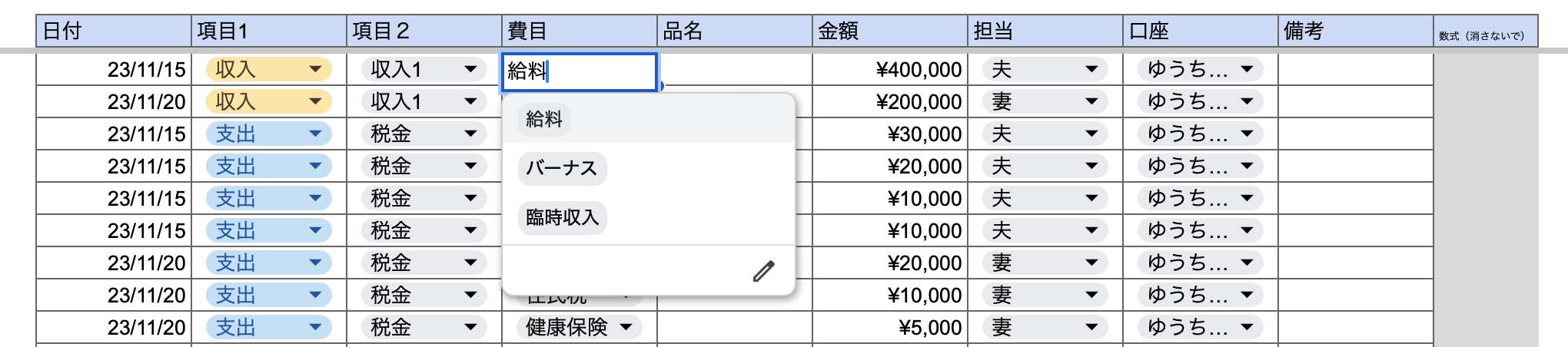 「夫給料」、「妻給料」と入力せずに、「給料」と入力してください。