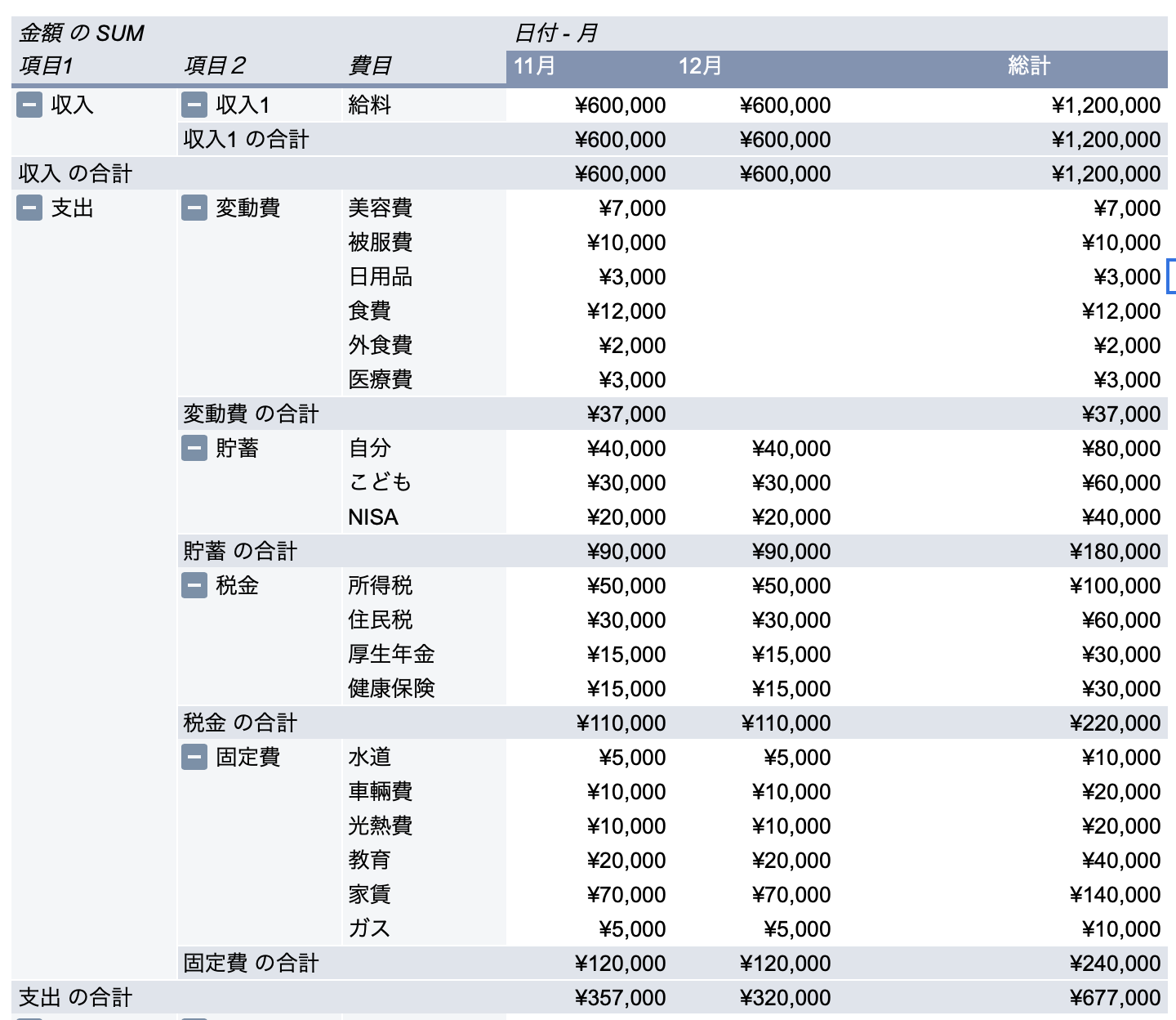 ピボットテーブルでは、費目別の消費金額を月ごとに一覧で表示されます。