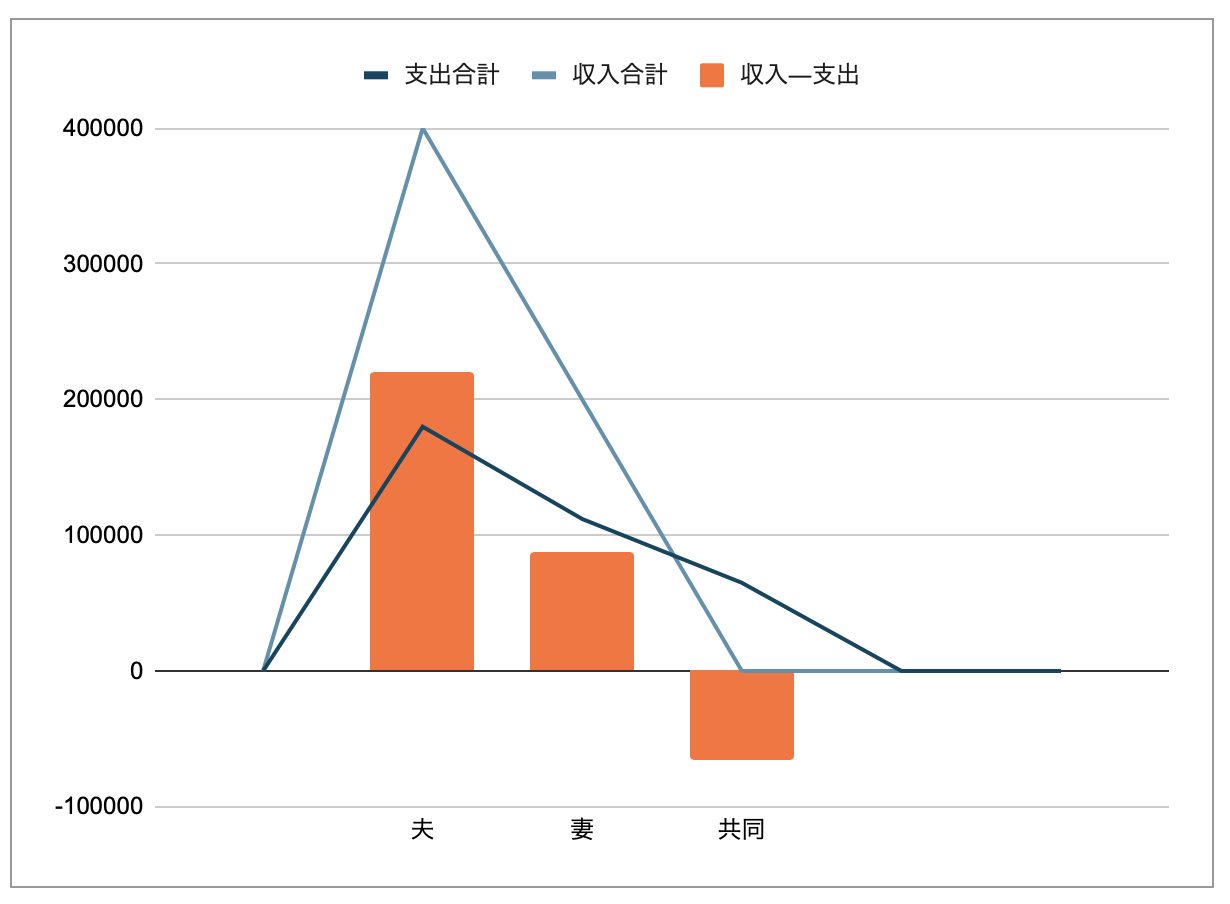 担当別の収入と支出の合計金額、残金をグラフで表示。