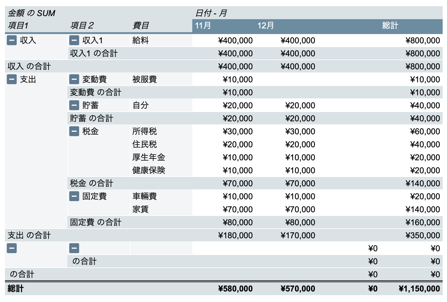 一番下の「総計」は、収入と支出の合計金額が表示されるのでご注意ください。