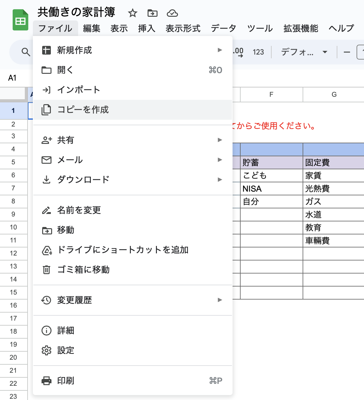 コピーを作成をクリック、名前を「共働き家計簿の原本」などと名前付けしてください。