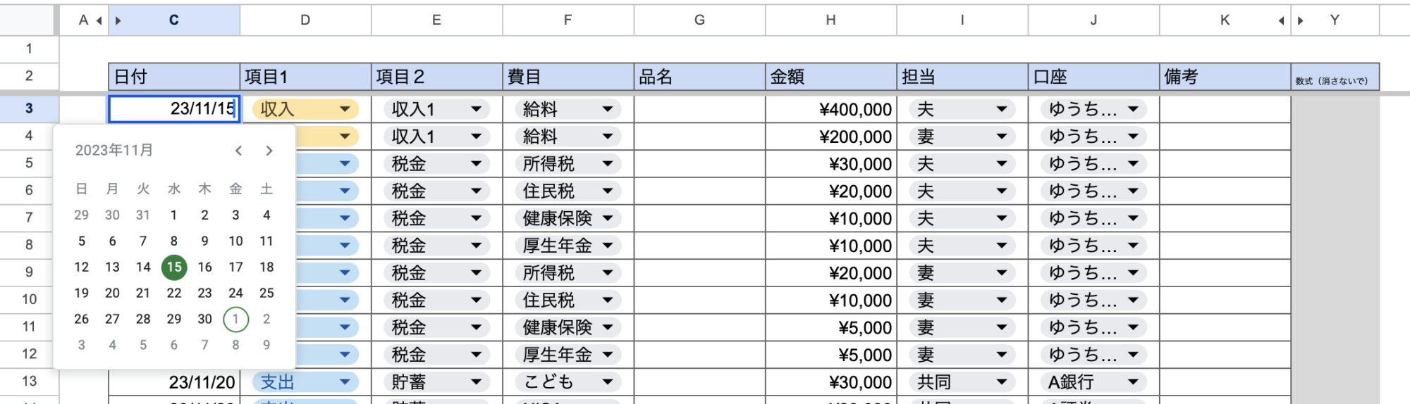 日々の収入、支出の項目を入力します。