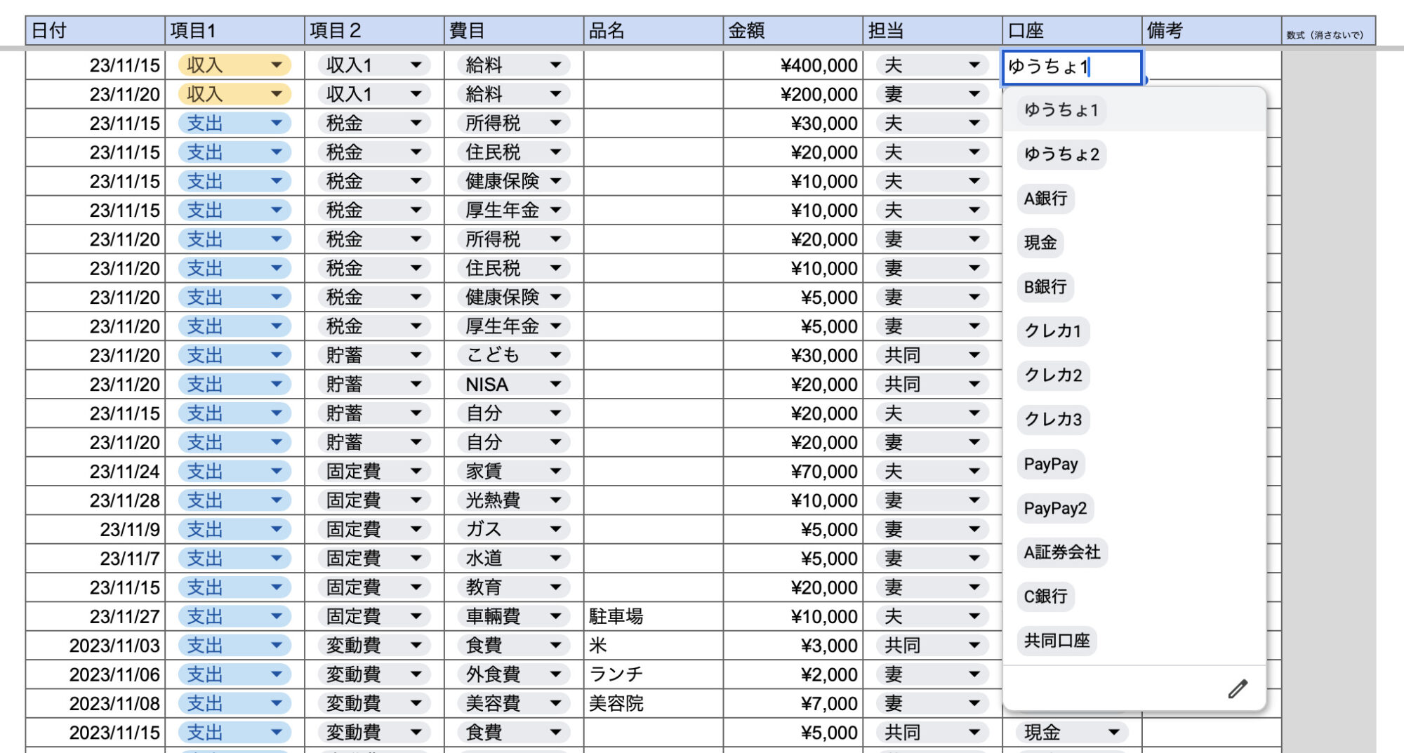 現金やPayPayなどはまとめずに、現金夫、現金妻など別々に登録してください。