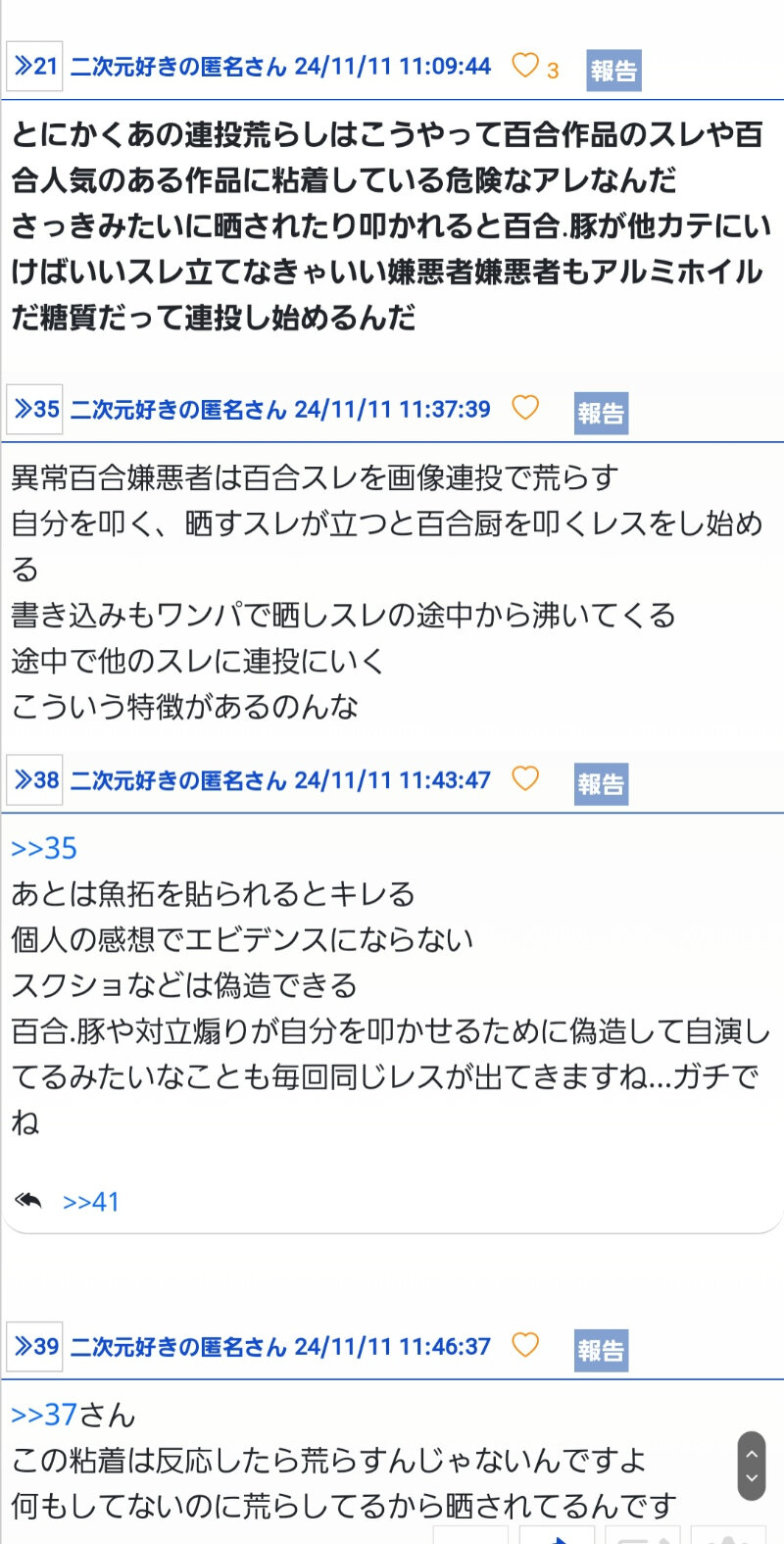 同一人物の別レスを通報しまくると管理人に通知が行くか仮規制か何かに引っかかるのかもしれないね