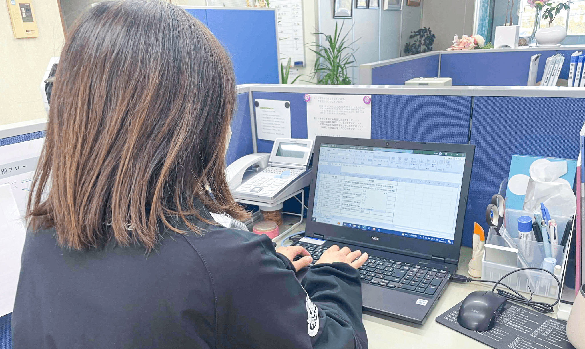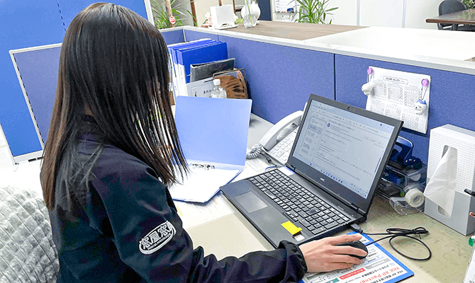 その業務は経理・広報・会社美化をはじめ、スタッフみんなが働きやすい環境づくりを行いながら、様々な角度から会社並びに社員のみんなを支えるお仕事。裏方としてみんなのサポートを行い、一つ一つの業務をスムーズに進める為の影の立役者!