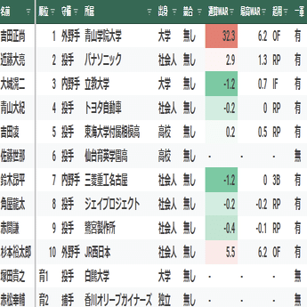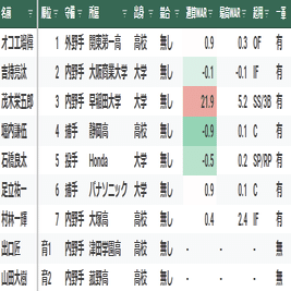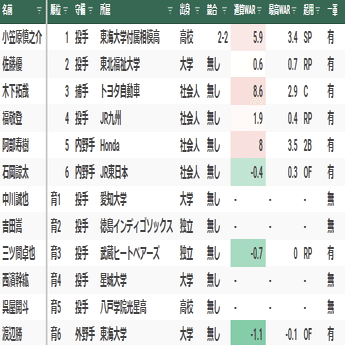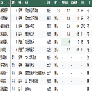 【寸評】1位指名の多和田真三郎は、最速152キロの本格派右腕。大学4年秋のリーグ戦は右肩痛により登板機会は無かったが、大学1年時の全国大会でノーヒットノーランを達成するなど実力は折り紙付きだった。3年目の2018年に16勝を上げ最多勝を獲得し、チームの優勝に貢献。しかし、翌2019年以降は自律神経失調症を患ったこともあり、成績が低迷。そこから復調することなく2021年に戦力外となった。