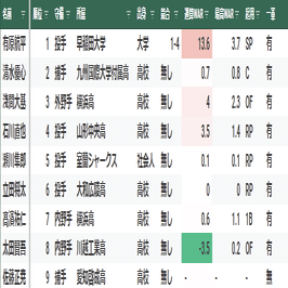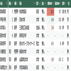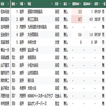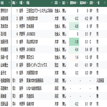 【寸評】1位指名の横山雄哉は、最速151キロの本格派左腕。高卒社会人であり、調子の波が激しいことから未完の大器という評価。プロ入り後は、度重なる怪我に見舞われ1軍登板は、わずか9試合に終わる。