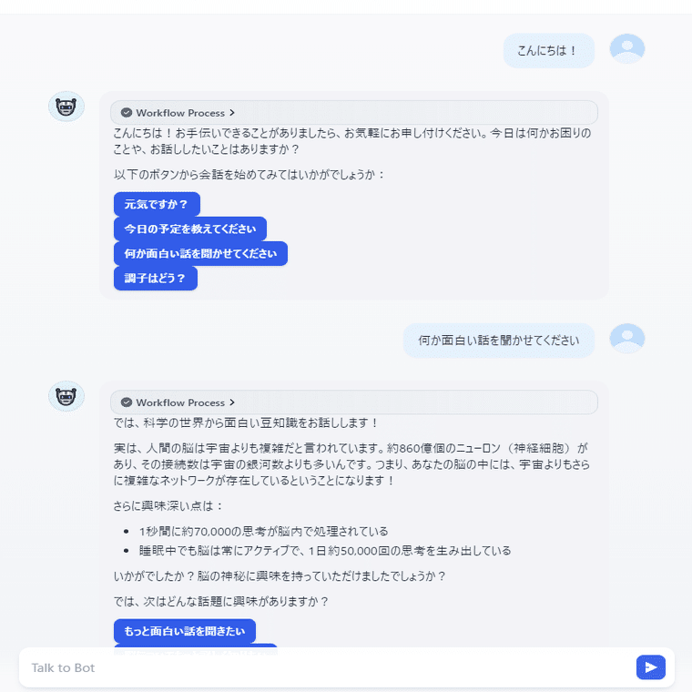 以下のように、AIに次の内容を提案してもらいそのまま会話をボタンを押すだけで継続することが出来ます。