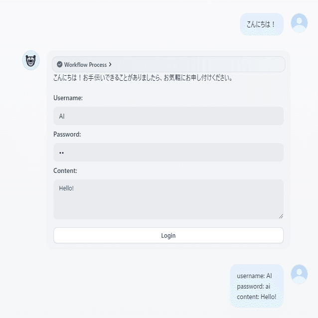 また、LLMに上記のテンプレートのフォーマットを指定することで先ほどの会話のようにAIが内容も生成して回答することが出来ます。