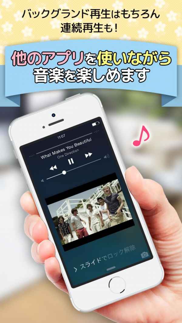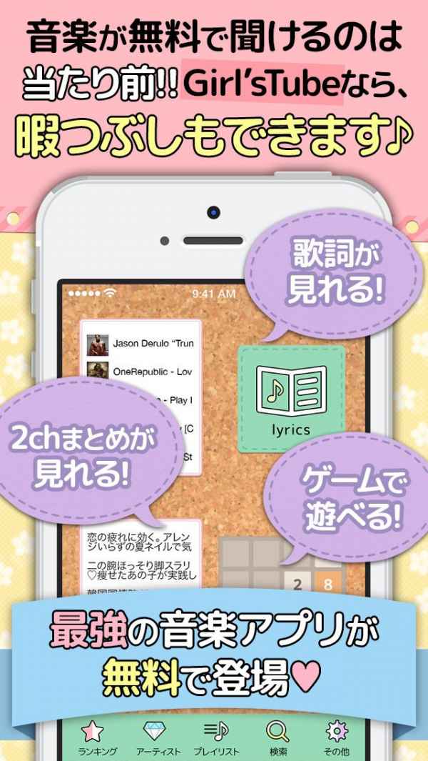 女の子向けの可愛いインターフェイスで、音楽が聞き放題のプレーヤーアプリです。 音楽や動画もダウンロードはしないので、著作権に触れることなく安心して楽しむことができます。 複雑な操作もなく、アプリを起動して2タップで音楽が聴けるので、手軽に使うことができます。 バックグラウンド再生もできて、歌詞を表示したり、ニュースを見たり、ミニゲームをしながらと、充実の機能が満載です。