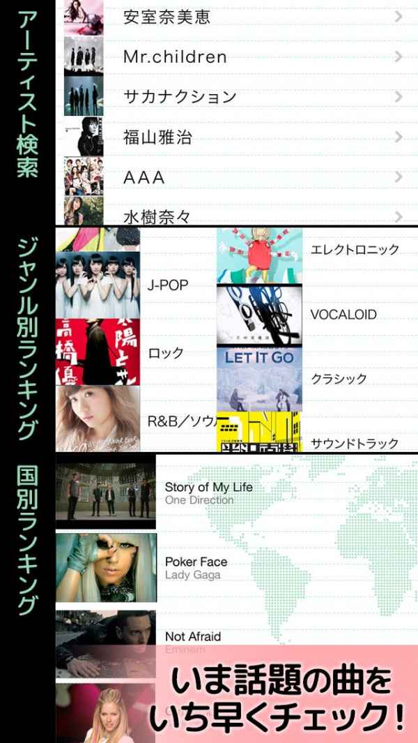 複雑な操作もなく簡単に扱えて、共有したい曲はTwitterやFacebookで共有できるので、大好きな曲をシェアし合って、友達と曲を一緒に楽しむことができます。