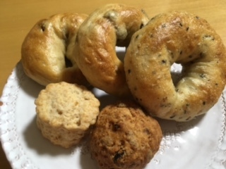 で、今日はベーグルのお買い得商品とプルーンのハード系パン、スコーン2種類を購入。