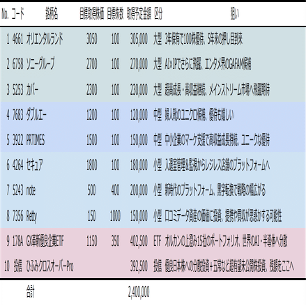 テーマや財務特性の異なる、大型銘柄、中・小型銘柄、さらには投信・ETFをバランスよく構成しました。240万円投資でできる最大限のリスク分散ではないですかね。