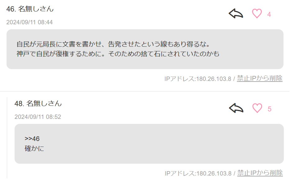 【ネット工作】兵庫・斎藤知事支持者「自民が元局長に文書を書かせ告発させた。神戸で自民が復権するために。そのための捨て石にされていた」→自作自演でレス付けて多数派を装う