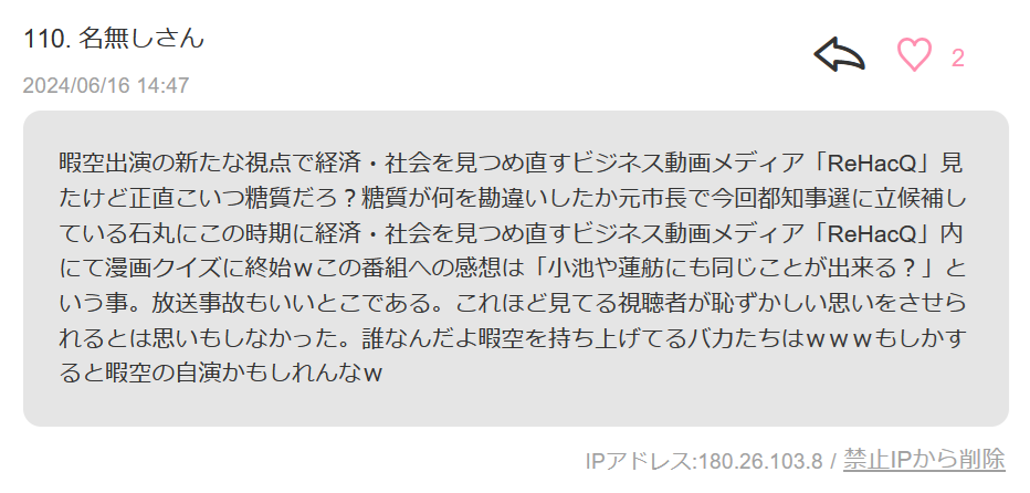 暇空出演の新たな視点で経済・社会を見つめ直すビジネス動画メディア「ReHacQ」見たけど正直こいつ糖質だろ?糖質が何を勘違いしたか元市長で今回都知事選に立候補している石丸にこの時期に経済・社会を見つめ直すビジネス動画メディア「ReHacQ」内にて漫画クイズに終始wこの番組への感想は「小池や蓮舫にも同じことが出来る?」という事。放送事故もいいとこである。これほど見てる視聴者が恥ずかしい思いをさせられるとは思いもしなかった。誰なんだよ暇空を持ち上げてるバカたちはwwwもしかすると暇空の自演かもしれんなw