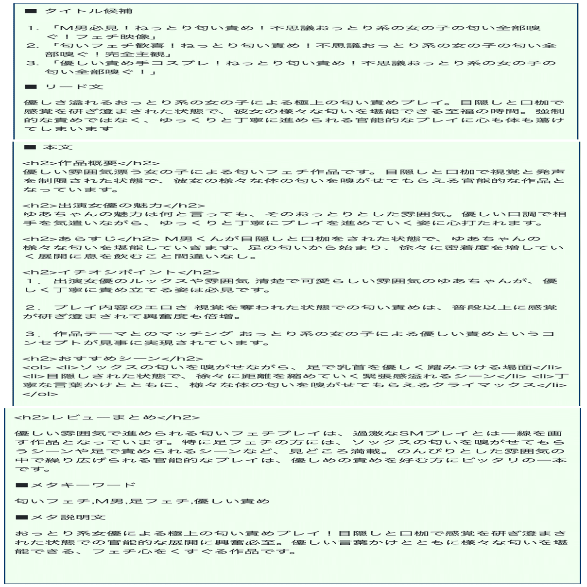 作品概要、リード文、女優の魅力、あらすじ、おすすめシーン、レビューまとめなどの、各見出しを作り、さらにそのままコピペで使えるようにソースコードで出力します(この機能はデフォルトですが任意で外せます)