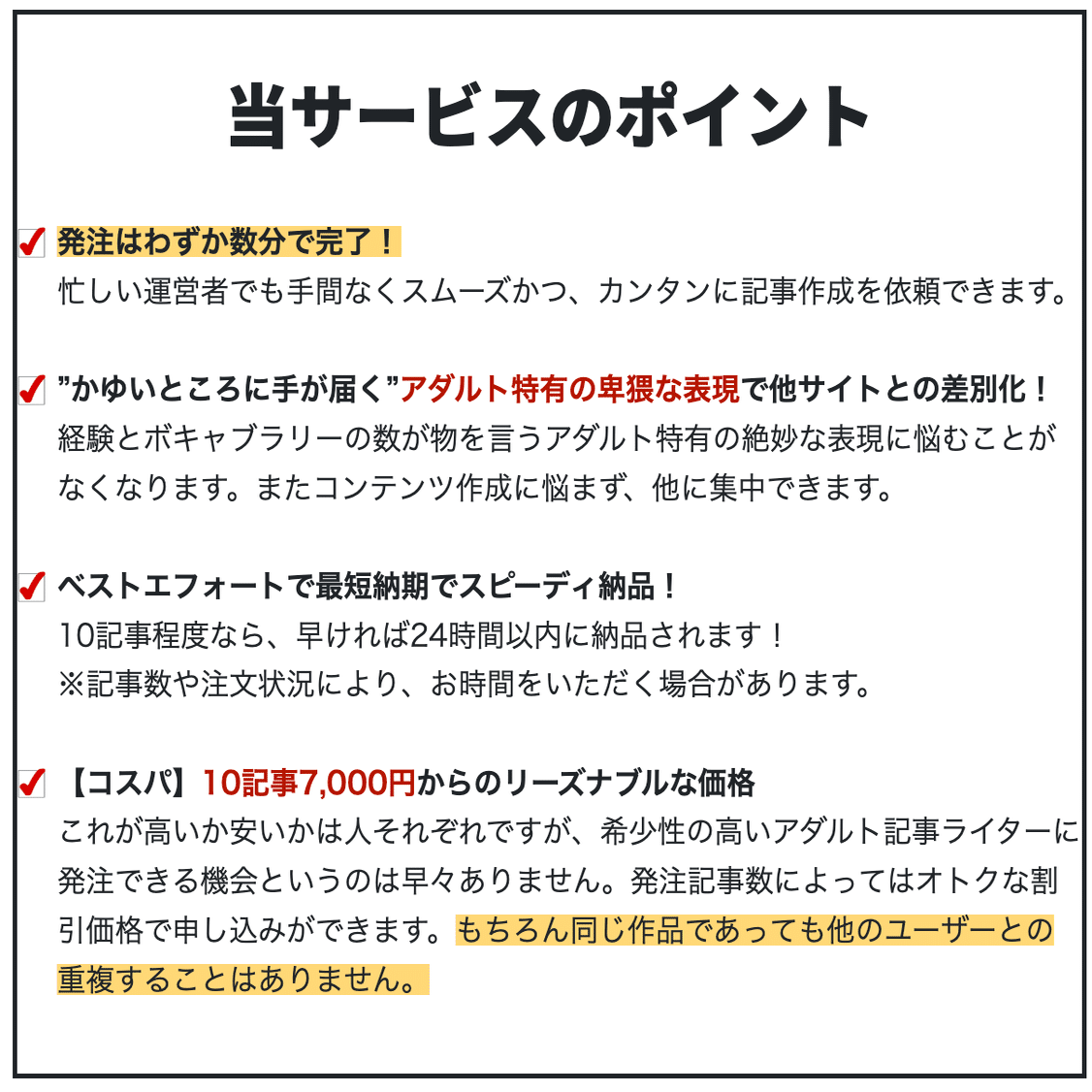 さらに、アダルトジャンルの記事は対応できるライターはなかなかいません。