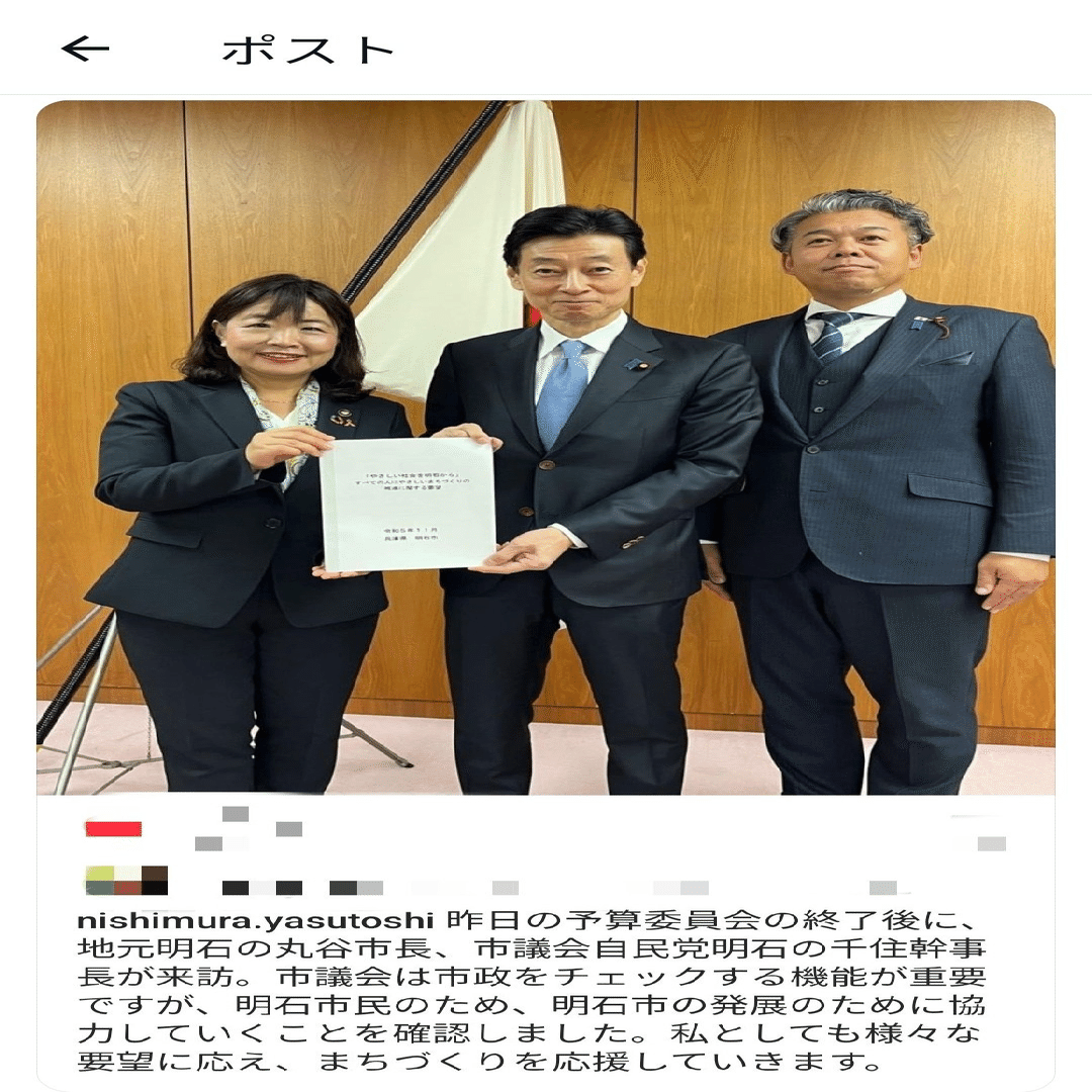 ◉【理由②】泉房穂の愛弟子・明石市長「丸谷聡子」が、齋藤元彦の親友「西村康稔」とズブズブの関係。
