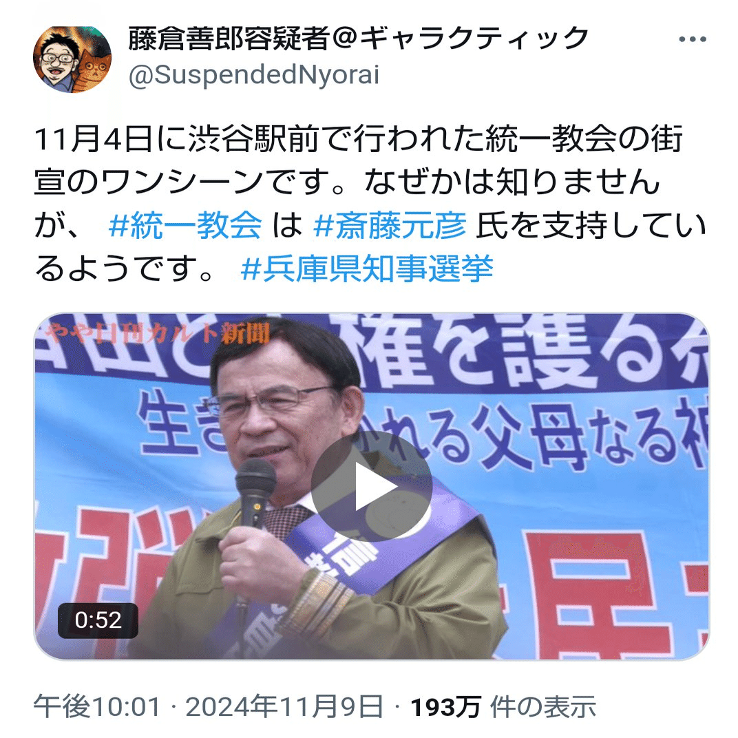 さいとう元彦を統一教会の人間が熱心に応援しているようです。 カルト問題に詳しい、やや日刊カルト新聞の藤倉氏のXにて街宣の様子が公開されています。 その他、統一教会側の弁護をやってきている徳永弁護士が熱心に斎籐元彦支援をしているとか、 最近統一教会との会合や、統一教会の主張を岸田総理に直談判など、統一教会度接近しているNHK党が斎籐支援に参戦していることから言われています。 ネットの炎上に、統一教会側が否定のコメントを出すも、 その後統一教会の新聞である世界日報で斎籐を熱心に擁護する記事を掲載するなど、極めて怪しい状況にあると思います。 統一教会は勧誘や搾取の問題でも 「信者が勝手にやったものであり、組織関与せず」との主張をしてきた組織であり ときにはその主張が認められず組織責任が問われてもいます。 今回も似たような状況ではないでしょうか。 (ヤフー知恵袋より引用)